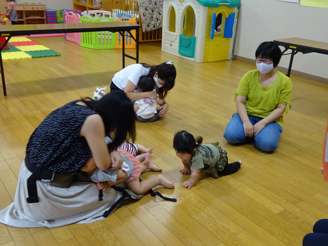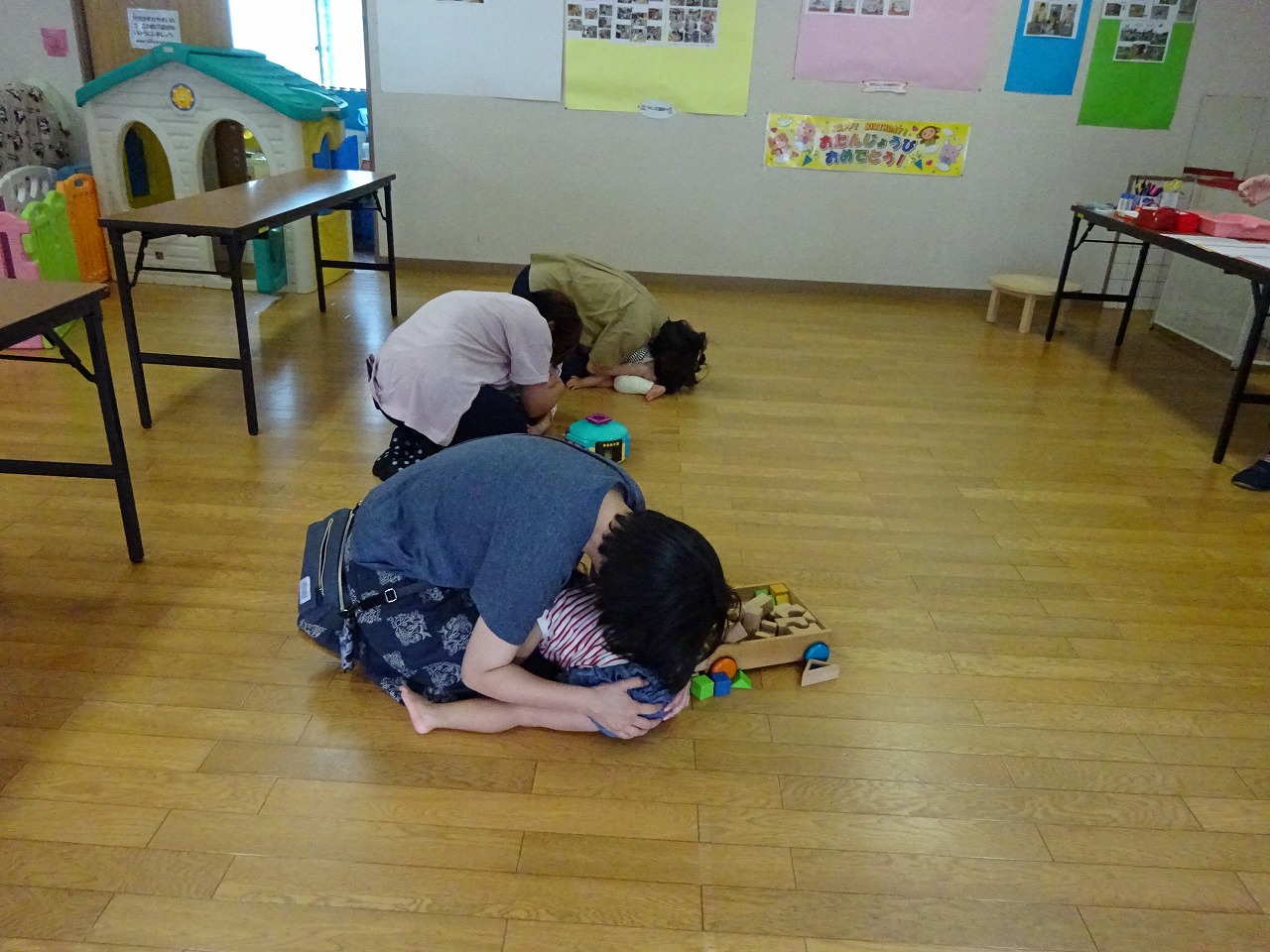 9月1日〜9月3日に防災の日に因んで防災に関する話をしました。 3日間、たくさんの方が参加して下さり一緒に防災に対する意識を高めることができました。 家庭でもしも起こった場合にどんなことができるのかを参加者の皆さんと考える良いきっかけになった行事となりました。 親子でできる”ダンゴムシポーズ”も皆さんで練習しましたが、お母さん方の見事なポーズにとっても感動しました。