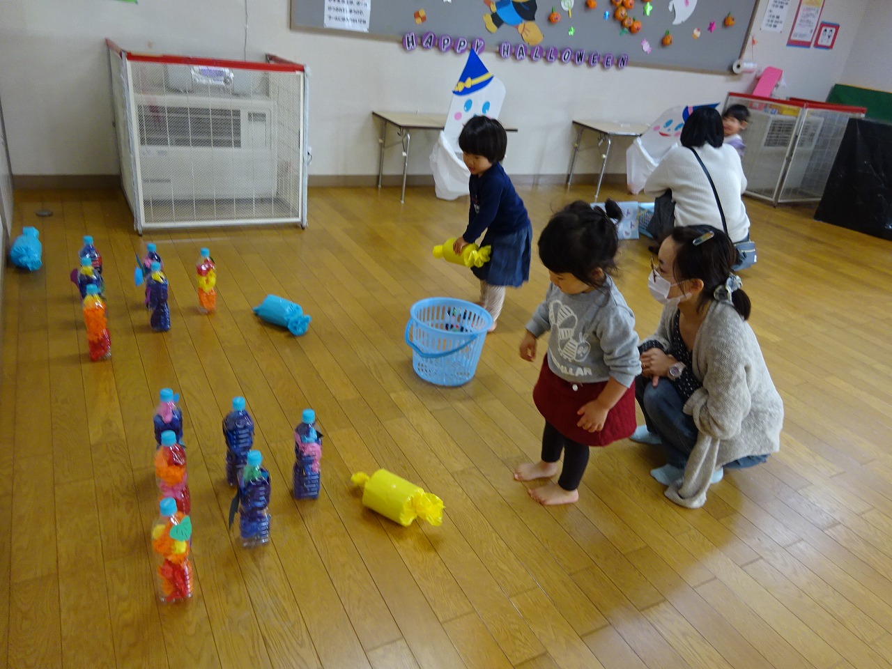 つくって遊ぼうの『ハロウィンコスチューム』を着て、壁面に参加して下さった方は『マイ パンプキンボール』でゴーストバスケットにボールをシュート!!ほかにもハロウィンボーリング、おばけのお家、フォトコーナーを設けました。ハロウィンに因んだコーナー遊びに夢中になって遊んでいる姿がとっても楽しそうでした。