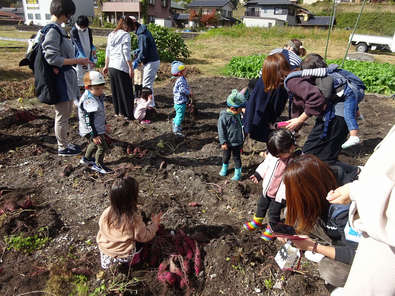 赤ちゃん組は野上の公民館までのショートコース、大きい子はひよっこ農園まで行きさつまいも掘りに挑戦!!