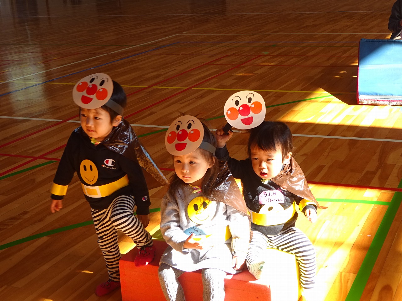 最後はアンパンマンになりきって、バイキンマンの箱に玉入れして、アンパンマン体操をして、楽しい時間はあっという間でした。