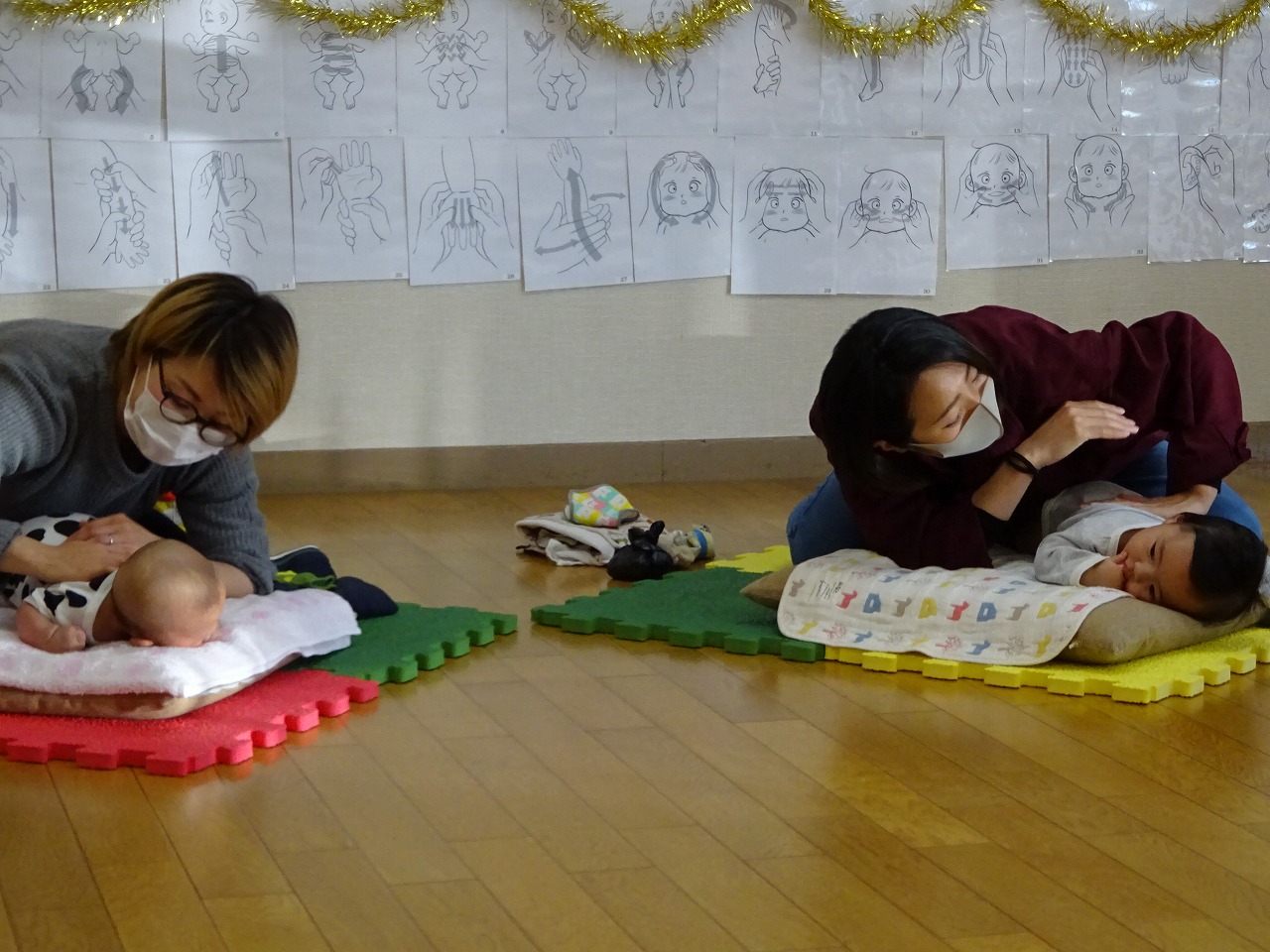 泣いていた赤ちゃんもマッサージが始まると泣き止んで、お母さんの優しい手が癒しを与えている雰囲気がとっても素敵で温かく感じました。