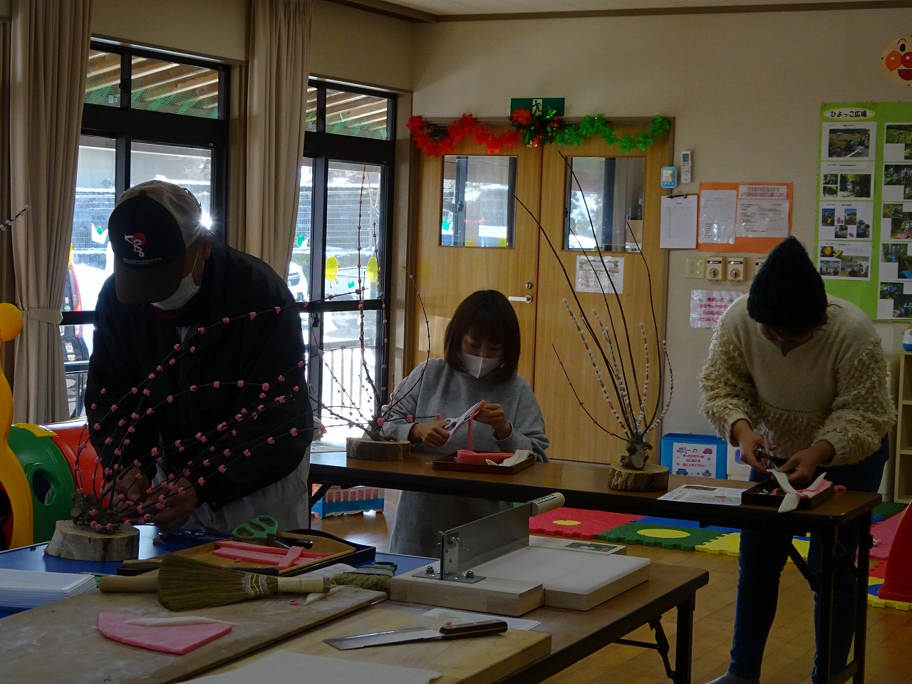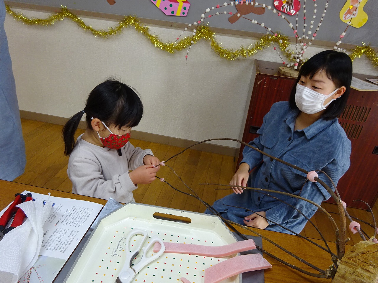 2日間限定8組ずつでしたが、託児も利用して頂きながらお母さんのペースで真剣に楽しく作り上げることができました。今年度で2回目の参加というお子さんは、昨年よりも成長した姿で枝に紅白のお餅を付けるお手伝いをして、お母さんと一緒に作ることもできました。