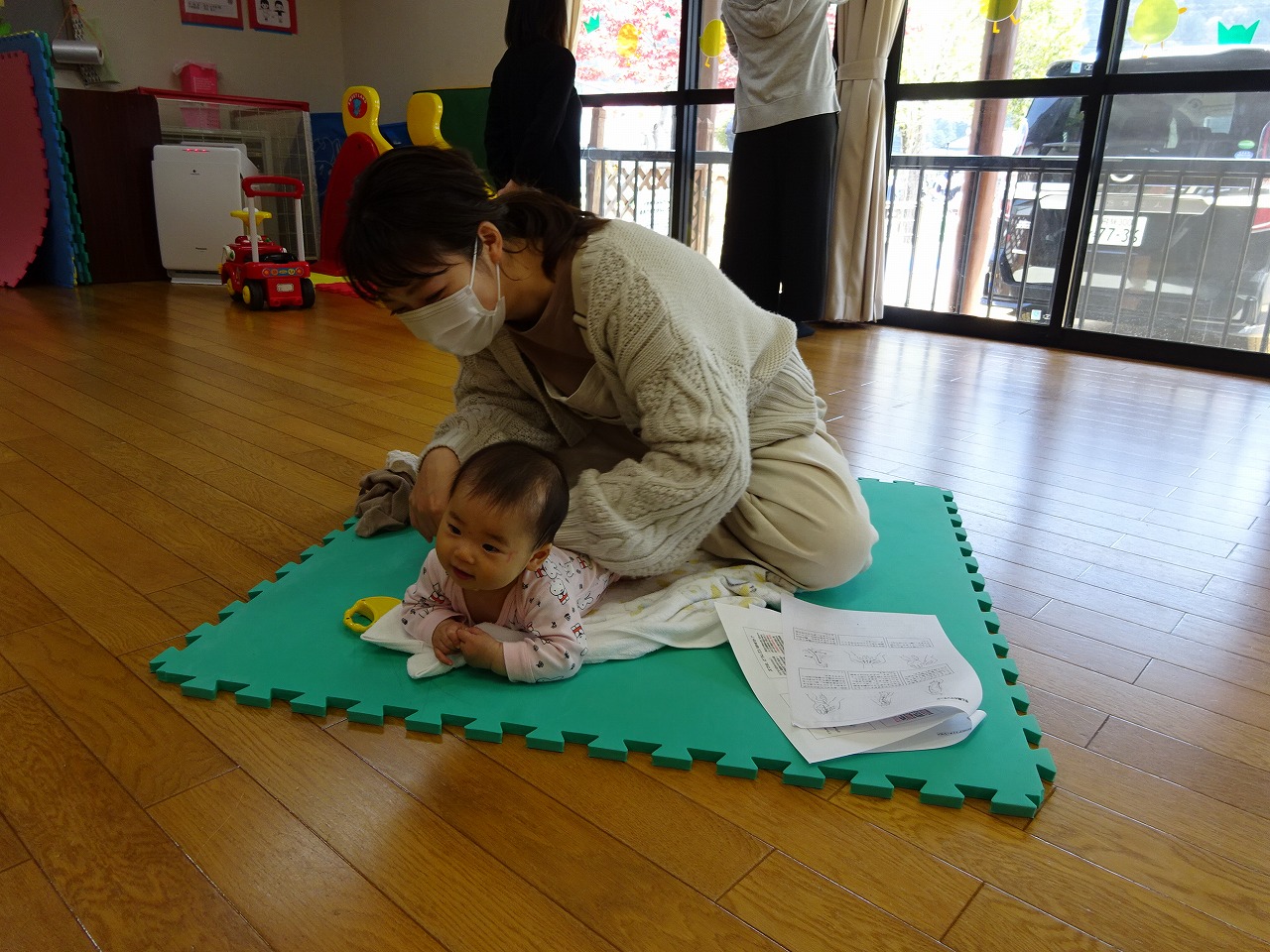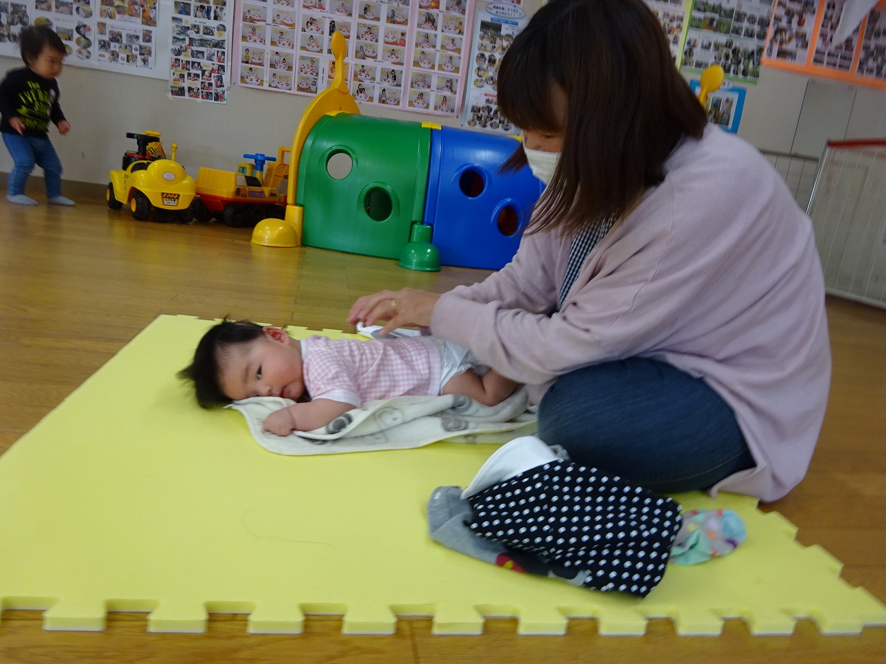 4月19日(月)今年度初めてのベビーマッサージが行われました。 今回は2組の親子が参加されました。普段は上のお子さんがみえ、下の子とじっくりと関わる時間がなかなかないとおっしゃっていましたが、今日は下の子と1対1でゆったりと過ごすことができ、お母さんも赤ちゃんもとっても嬉しそうでした。 今年度も小林英子さんを講師にお招きし、お母さんと赤ちゃんがゆったりと関われる時間を作っていけたらいいなと思っています。