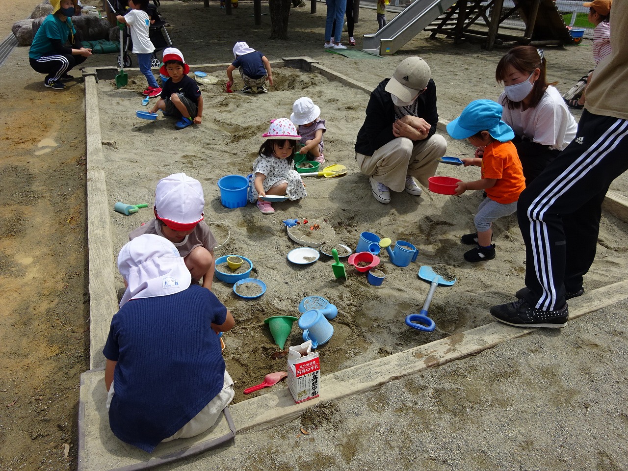 6月25日に今年度初めての園庭開放を行い11組の親子の参加がありました。 普段は遊べない大きな砂場や遊具に大喜びで、とても楽しそうに遊ぶ姿が微笑ましかったです。お片付けの後は園児と一緒にアンパンマン体操をし、最後まで元気いっぱいの子どもたちでした。