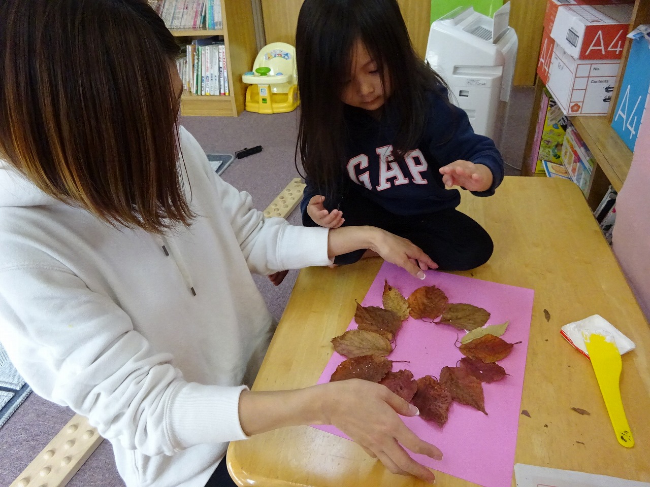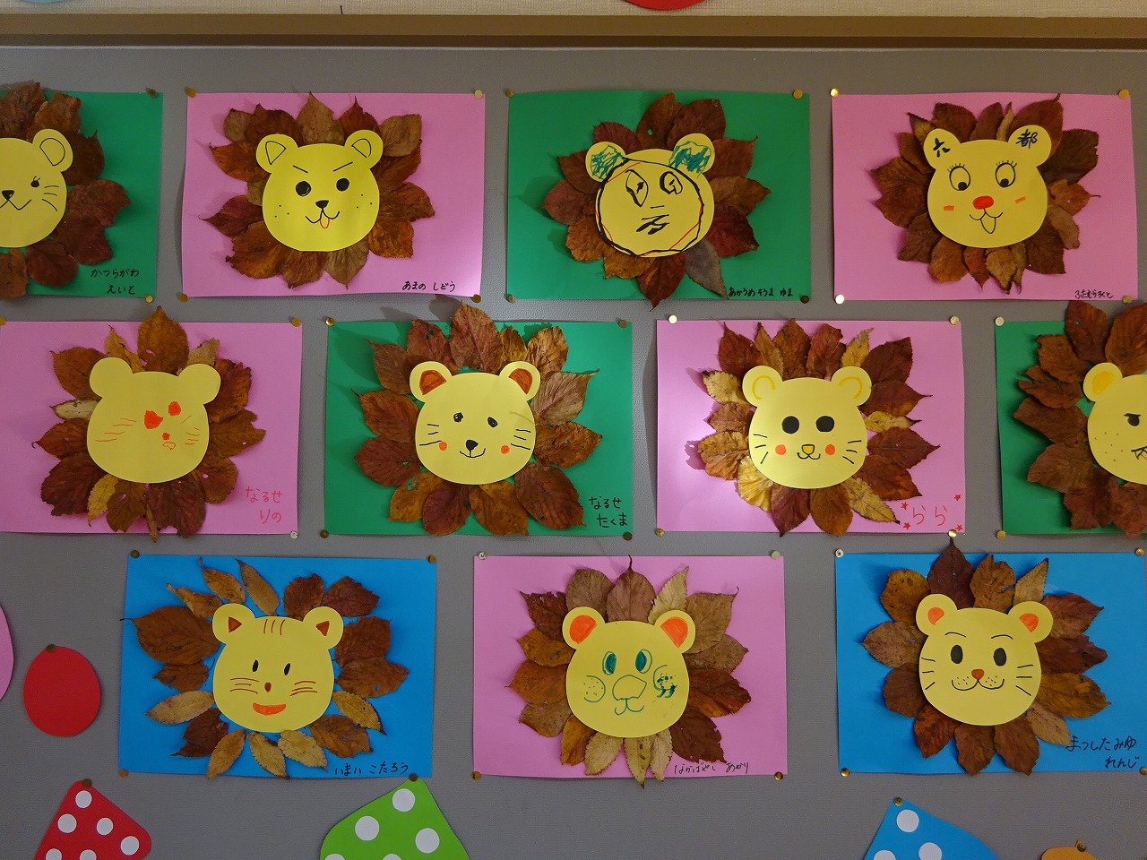 11月8日〜11月19日まで落ち葉を使った葉っぱアートでライオンを作りました。 児童館の落ち葉や、お家から拾ってきた葉っぱを使いライオンのたてがみにしました。顔は子どもたちが描いたり、お母さんが一緒に描いたりといろいろな表情のかわいらしいライオンが完成しました。みんなのライオンでとっても楽しい壁面になりましたよ。