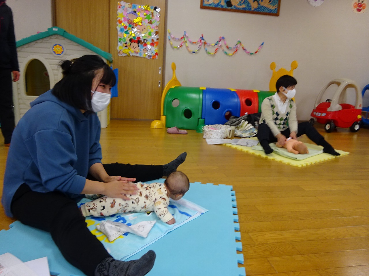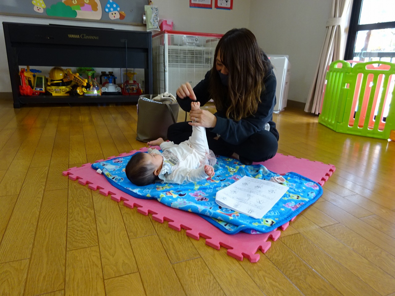 今月から萩原子育て支援センターと合同でベビーマッサージを行うことになりました。4組の親子の参加がありました。お母さんの顔をじっと見つめ一生懸命声を出す子や、気持ちよいマッサージで眠たくなる子と、それぞれゆったりと心地よい時間を過ごせました。