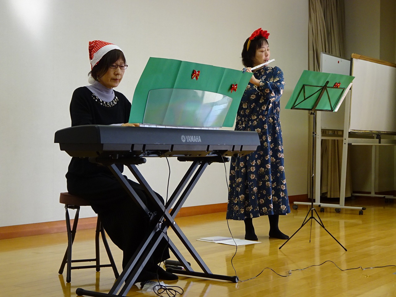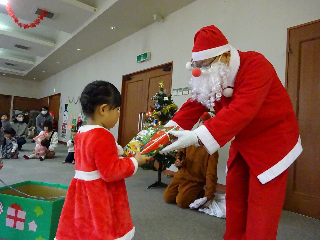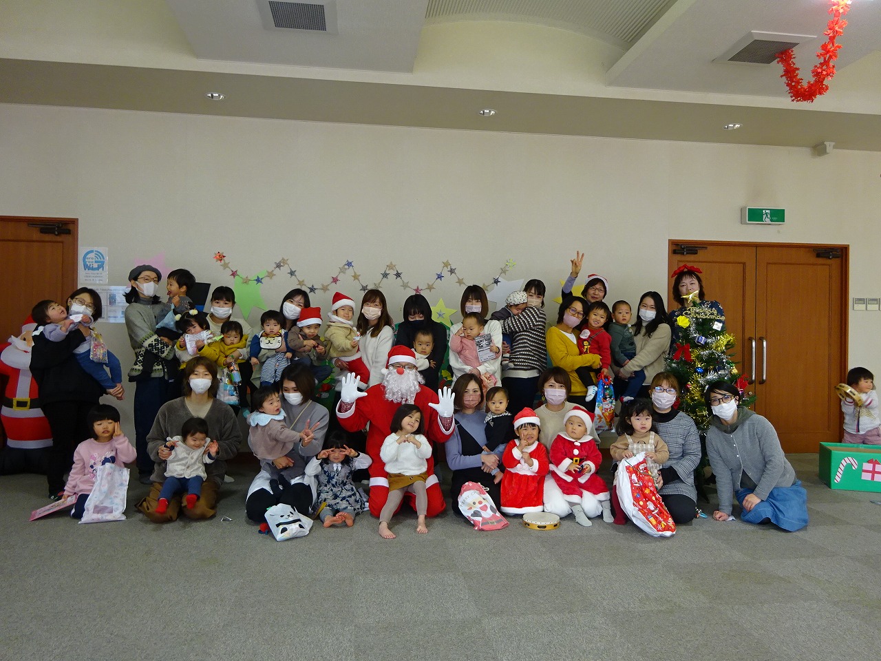 12月21日に乳幼児学級のクリスマス会が行われました。16組の親子の参加がありました。 まずはピアノとフルートによるクリスマスコンサートが行われ、大人も子どもも素敵な音色に癒されました。役員さんが準備して下さった手作りツリーにみんなで飾り付けをするといよいよサンタさんの登場!一人ずつプレゼントをもらいみんな大喜びでした。最後にみんなで一緒に楽器の演奏をし、とってもあたたかい会になりました。