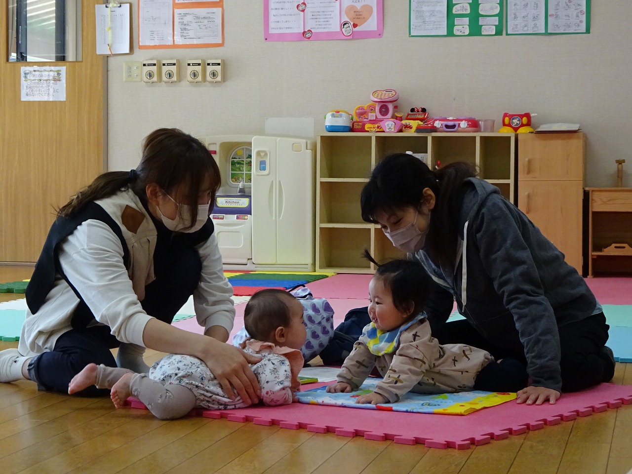 3月25日にベビーマッサージを行い、4組の親子の参加がありました。 前回参加してくれたお子さんの成長に驚いたり、子ども同士が向き合って声を出しおしゃべりしたりと微笑ましい光景がたくさんありました。先生とお母さんやお母さん同士の会話も盛り上がり良い交流の場となりました。 次回は4月21日(木)を予定しています。