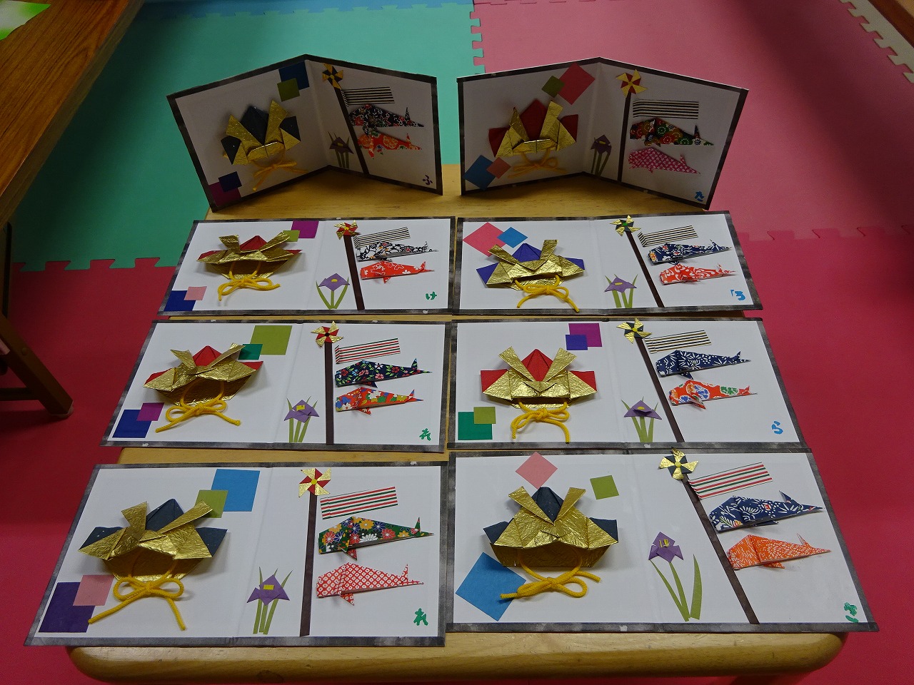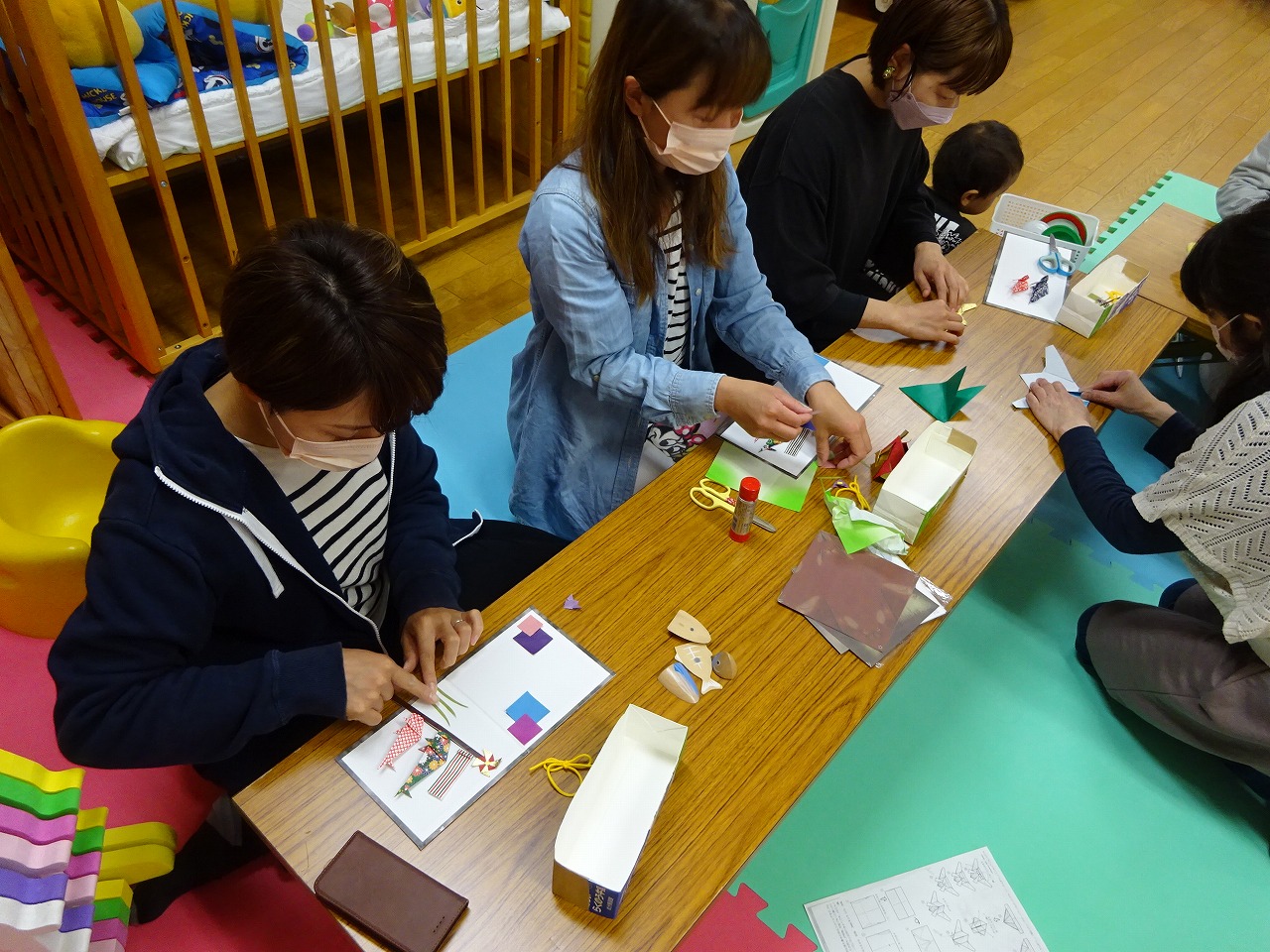 4月26日(火)講師に熊?弘美さんをお招きし、折り紙教室「端午の節句」を行いました。折り紙で兜とこいのぼり2匹を折りました。お母さんたちや講師の先生とお話ししながらとっても和やかな雰囲気の中素敵な作品が出来上がりました。「久しぶりに折り紙をしたので楽しかったです」や「家ではなかなか作れないので楽しかったです」等の感想がありました。どの方もとても満足いく作品になったようで良かったです。