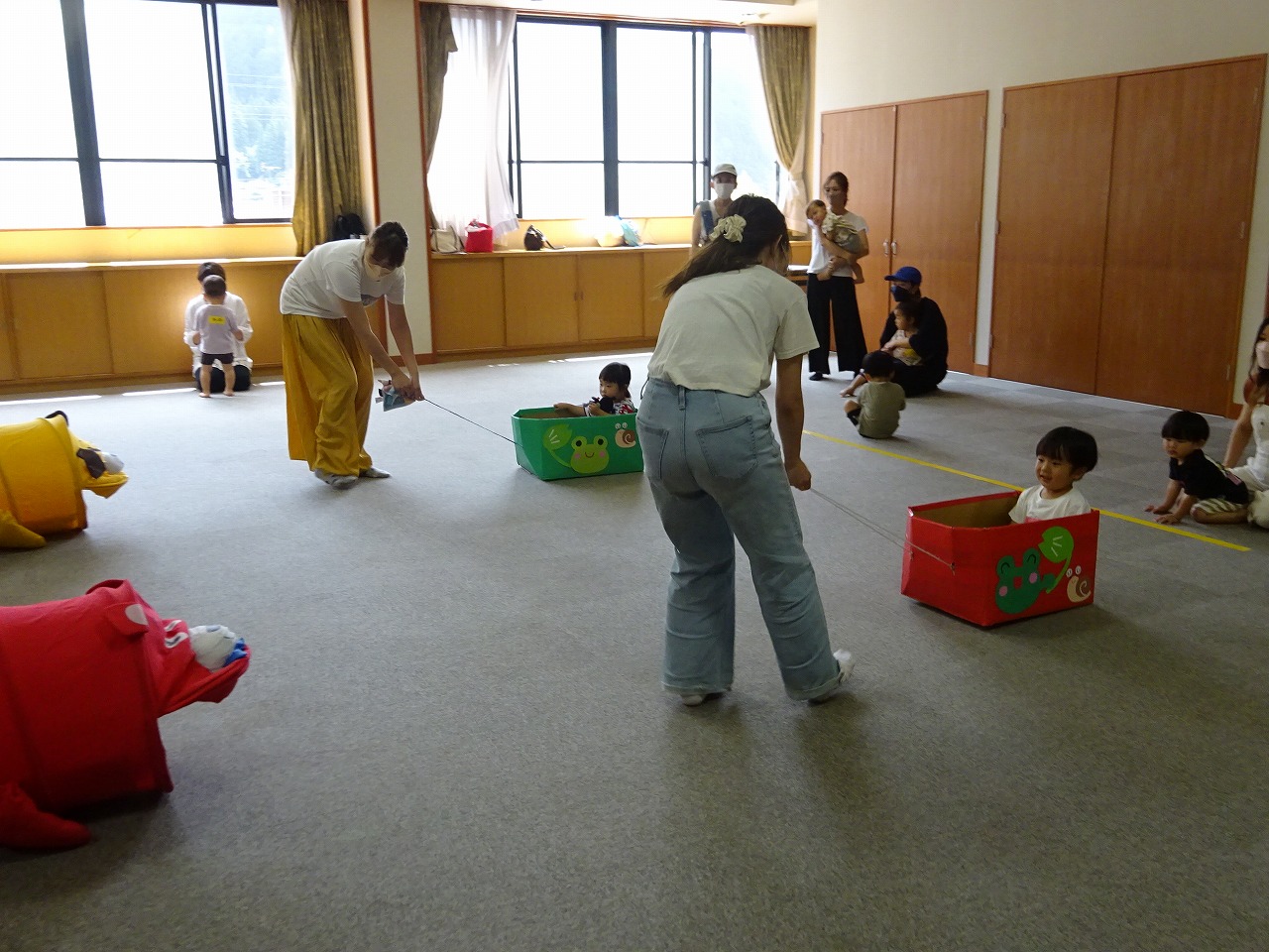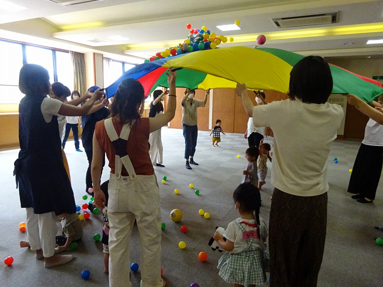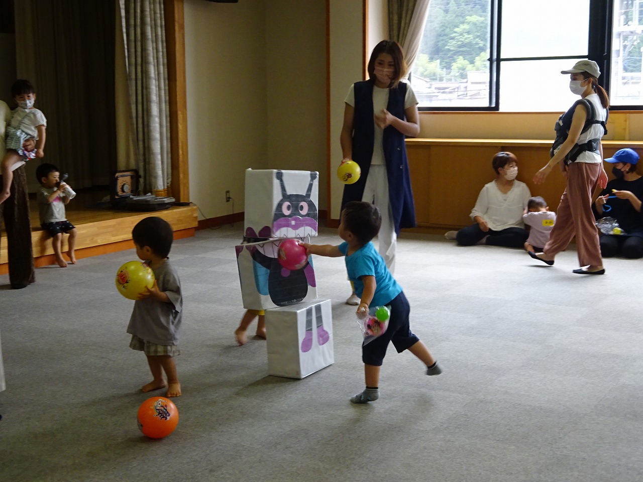 6月23日(木)ひよっこクラブ(乳幼児学級)でちびっこ運動会を行いました。 お母さんたちがバルーンを持ち子どもたちはその中に入ったり、「いち、にの、さん」でたくさんのボールが降ってきたりと、子どもたちは大喜びでした。よーいどん!では段ボールの車に乗った後、トンネルをくぐりバイキンマンを「アンぱーんち!」で倒しました。最後には素敵なプレゼントももらえましたよ。どの子もとっても楽しかったようでもう一回やりたい!と何度も楽しんでいました。