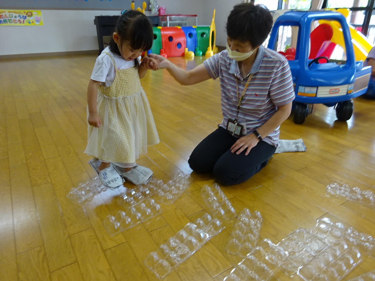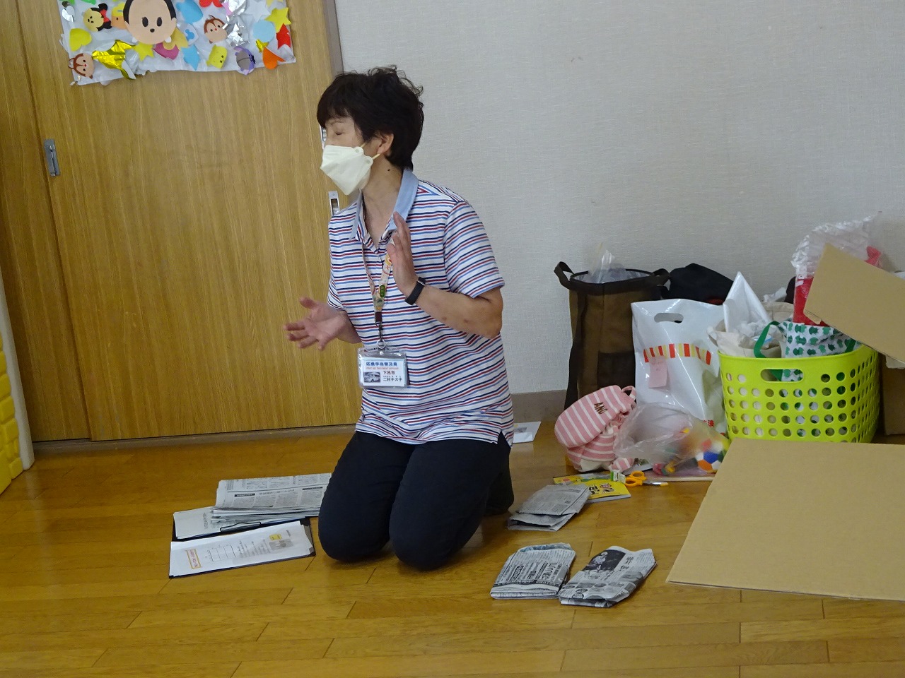 9月7日(水)防災士の二村チズ子さんを講師にお招きし、ママの勉強会「防災の話」を行いました。 牛乳パックでホイッスルを作ったり、新聞紙でスリッパを作って実際履いてみたりと親子で体験しながら楽しく話を聞くことができました。子どもを連れて避難することを考えた防災バックの作り方や、準備しておくと良い物など、とてもためになるお話が聞けました。常に準備しておくことは難しいかもしれませんが、実際災害が起きたら…と少しでも子どもや家族と考えておくことが大切だと思いました。