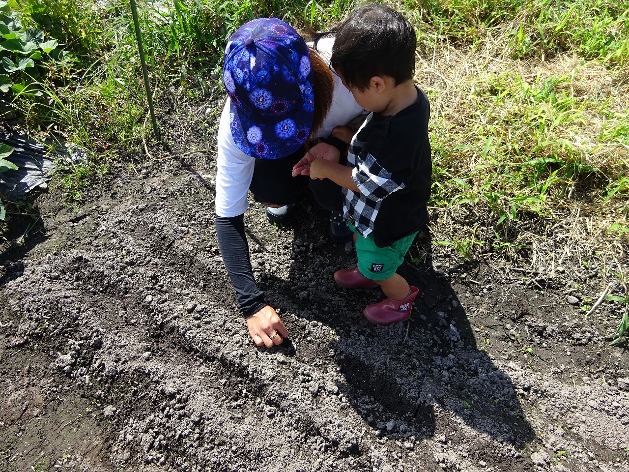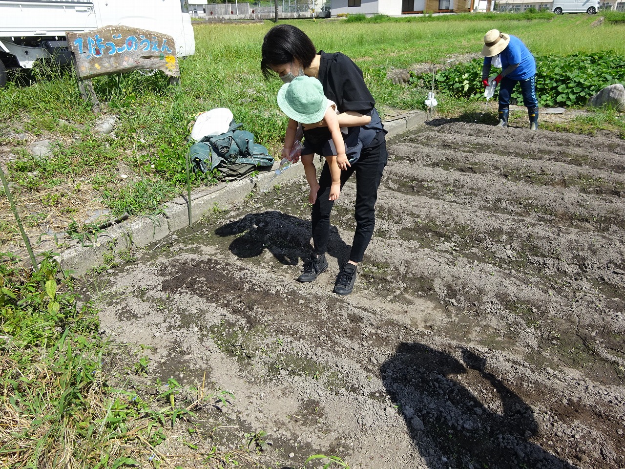 9月9日(金)、ひよっこ農園で大根の種まきを行いました。小さい種でしたが子どもたちも一粒ずつ一生懸命まいてくれましたよ。親子で「ここにひとつ入れてね」「土はそーっとかぶせるんだよ」と会話しながら楽しく種まきができました。ペットボトルのマイじょうろで水もたっぷりあげました。収穫が楽しみですね。
