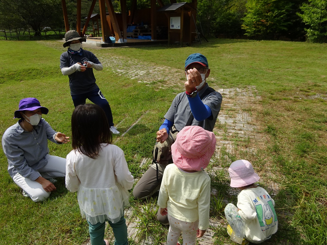 9月15日(木)、馬瀬・萩原子育て支援センター・北児童館コラボ企画で「皇樹の杜で遊ぼう」を行い、14組の親子の参加がありました。森のなりわい研究所所長の伊藤栄一さんを講師にお招き、自然の中で体操、虫や木の実についてのお話、木の枝のスラップ作りを行いました。大きなコオロギを夢中で追いかけたり、くっつき虫(ヌスビトハギ)で遊んだり、木の実、葉っぱ、草の名前を教えていただき身近にあるのに新しい発見がたくさんでした。子ども達はもちろん、お母さん方も興味津々で楽しい時間を過ごすことができました。