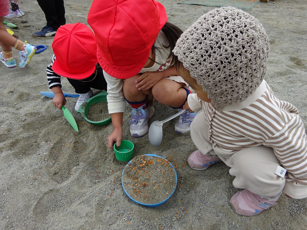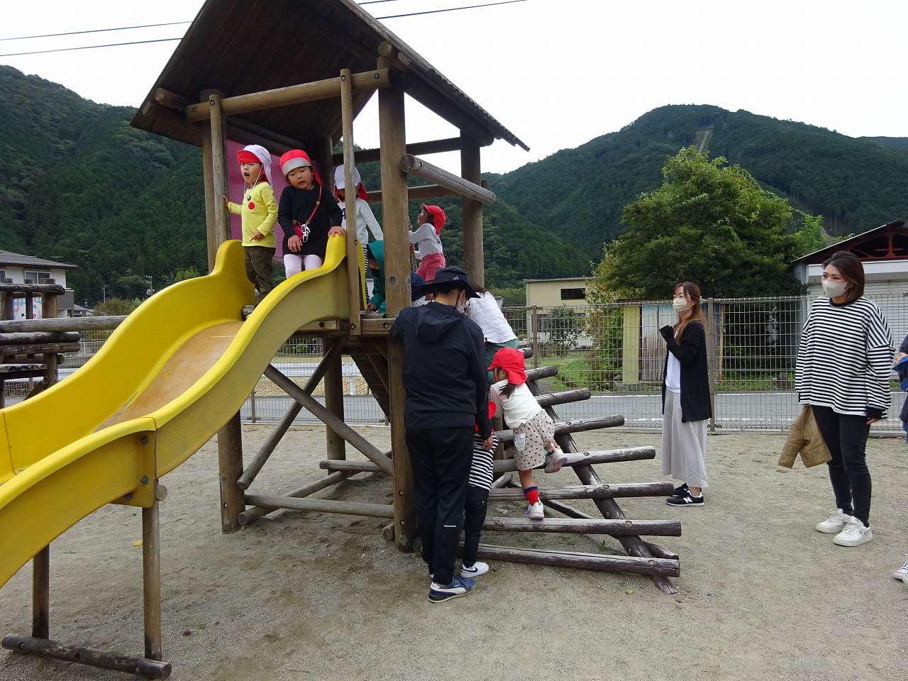 10月6日(木)園庭開放を行い11組の親子の参加がありました。風が強くとても寒い日となりましたが、子ども達は大型遊具に挑戦したり、滑りながらも築山に登ろうとするなど、体を動かし元気いっぱい遊びました。園児が外へ出てくると、兄弟で仲良く遊ぶ姿や、「かわいいね」と声をかけてくれる姿もあり、園児との交流も楽しむことができました。