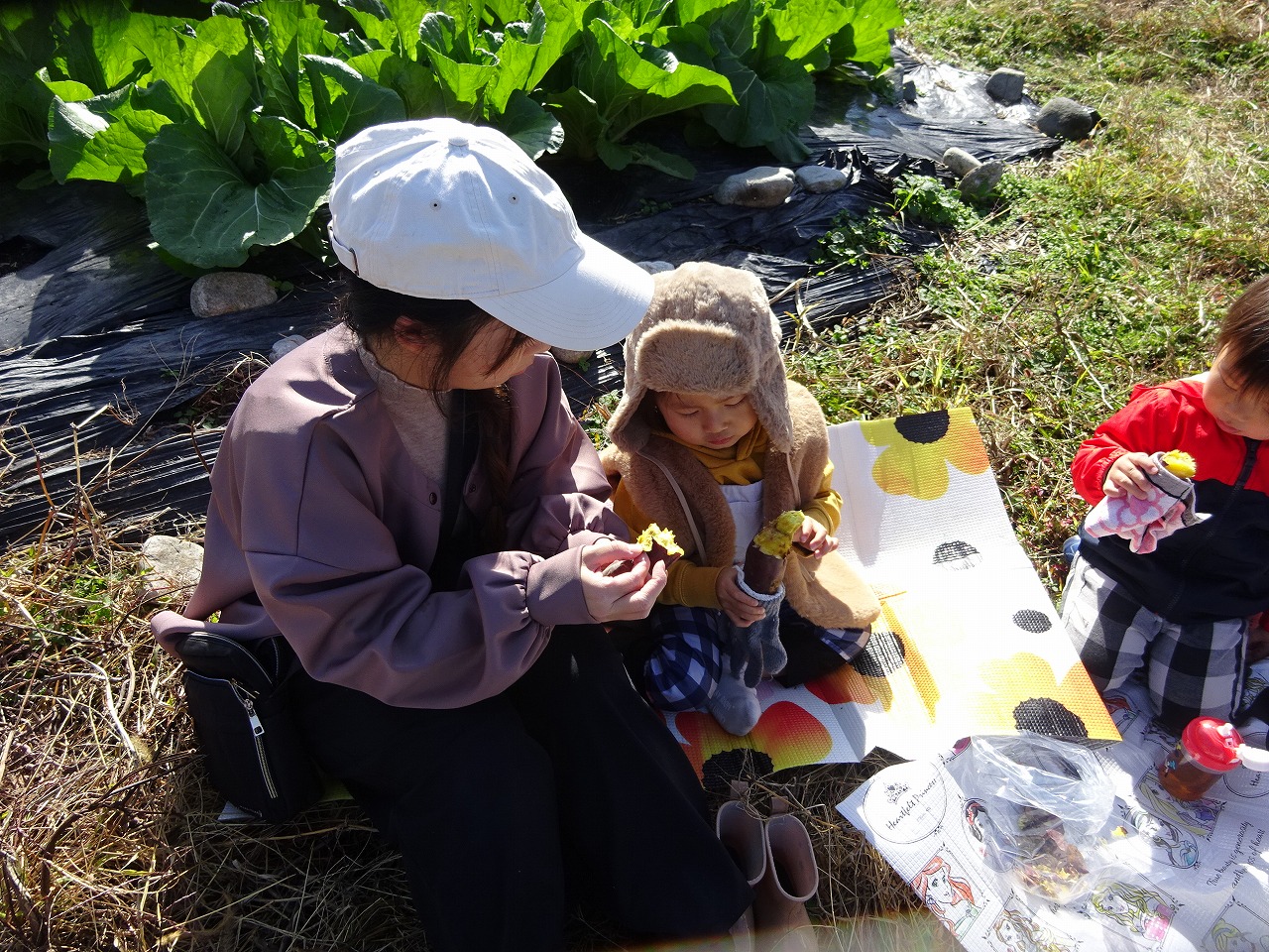 11月25日(金)ひよっこ農園でやきいもを行い5組の親子の参加がありました。とても天気が良く焼き芋日和となりました。もみ殻の中から焼き芋が出てくると「この中で焼いてるの?」と興味津々で見ている姿がありました。青空の下でみんなで食べる焼き芋はとっても美味しかったです。