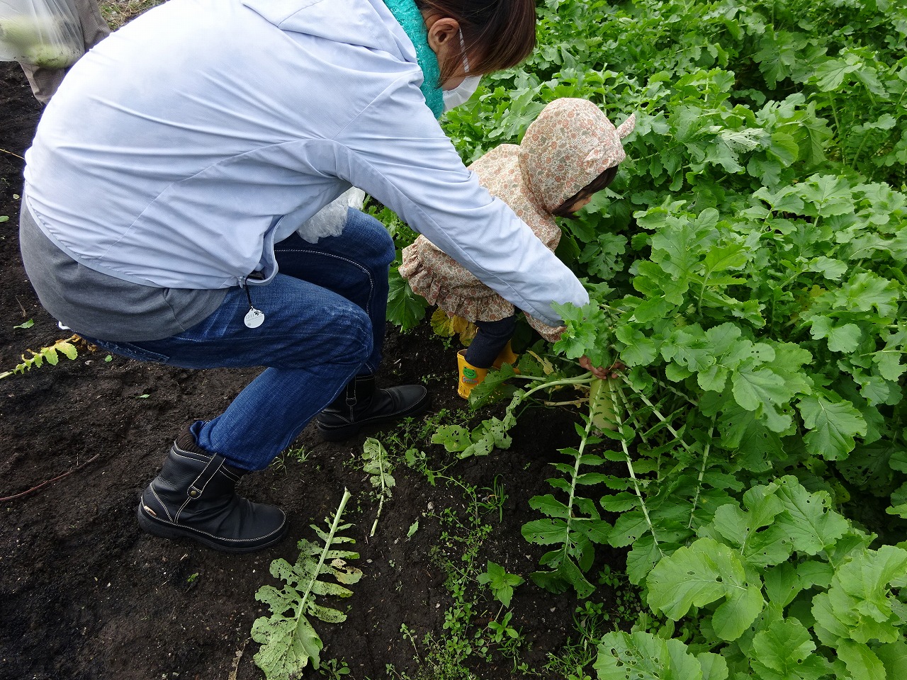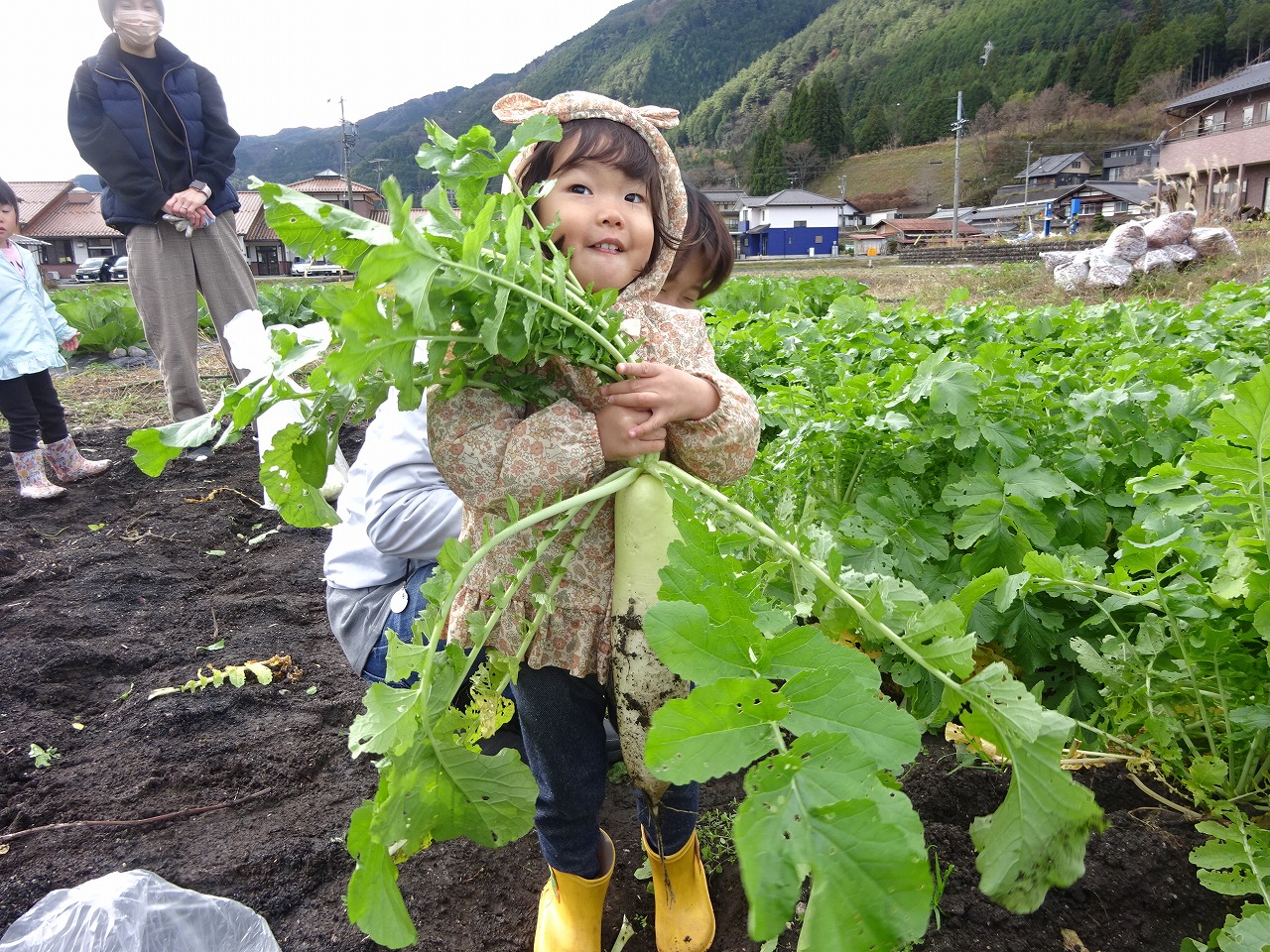 12月2日(金)ひよっこ農園で大根の収穫を行いました。4組の親子の参加がありました。子ども達は大きくてなかなか抜けない大根に苦戦しながらも「自分で抜く!」と頑張って引っ張る姿がありました。大根が抜けると尻もちをつきながら「やったー!」とみんなで大喜びでした。大きな大根を抱える姿はとっても満足気でしたよ。