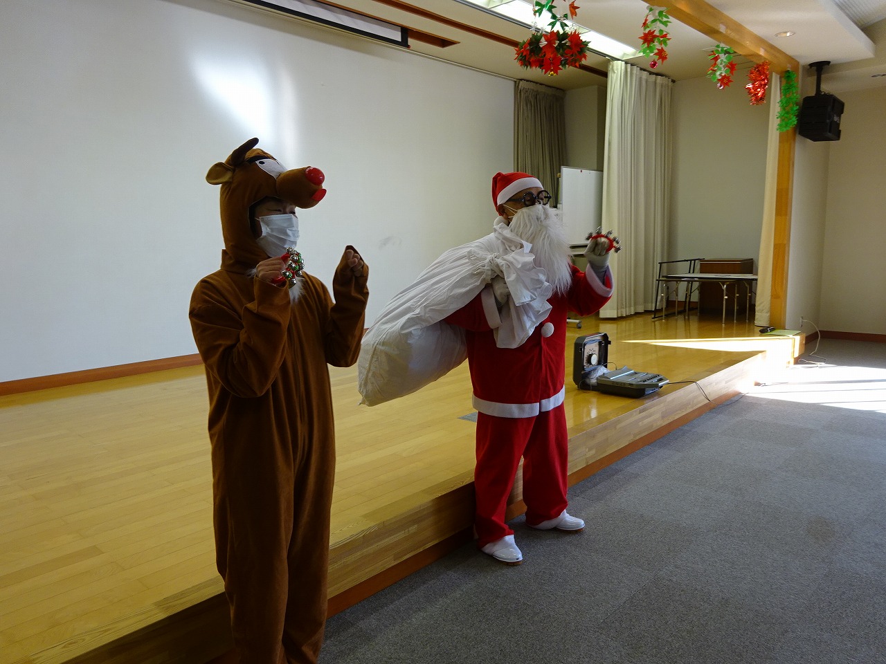 12月9日、ひよこくらぶのクリスマス会があさんず会館で行われました。役員さんが今日のために楽しい企画を準備して下さいました。始めに折り紙のクリスマスリースを作り、職員によるパネルシアターを観た後は待ちに待ったサンタさんとトナカイさんの登場!びっくりして泣いてしまう子もいましたが、とっても嬉しそうな子ども達でした。サンタさんにプレゼントをもらった後は、タンバリン、鈴、カスタネットでみんなでクリスマスソングの演奏をし、サンタさんもトナカイさんも子ども達もノリノリで楽しい時間を過ごすことができました。