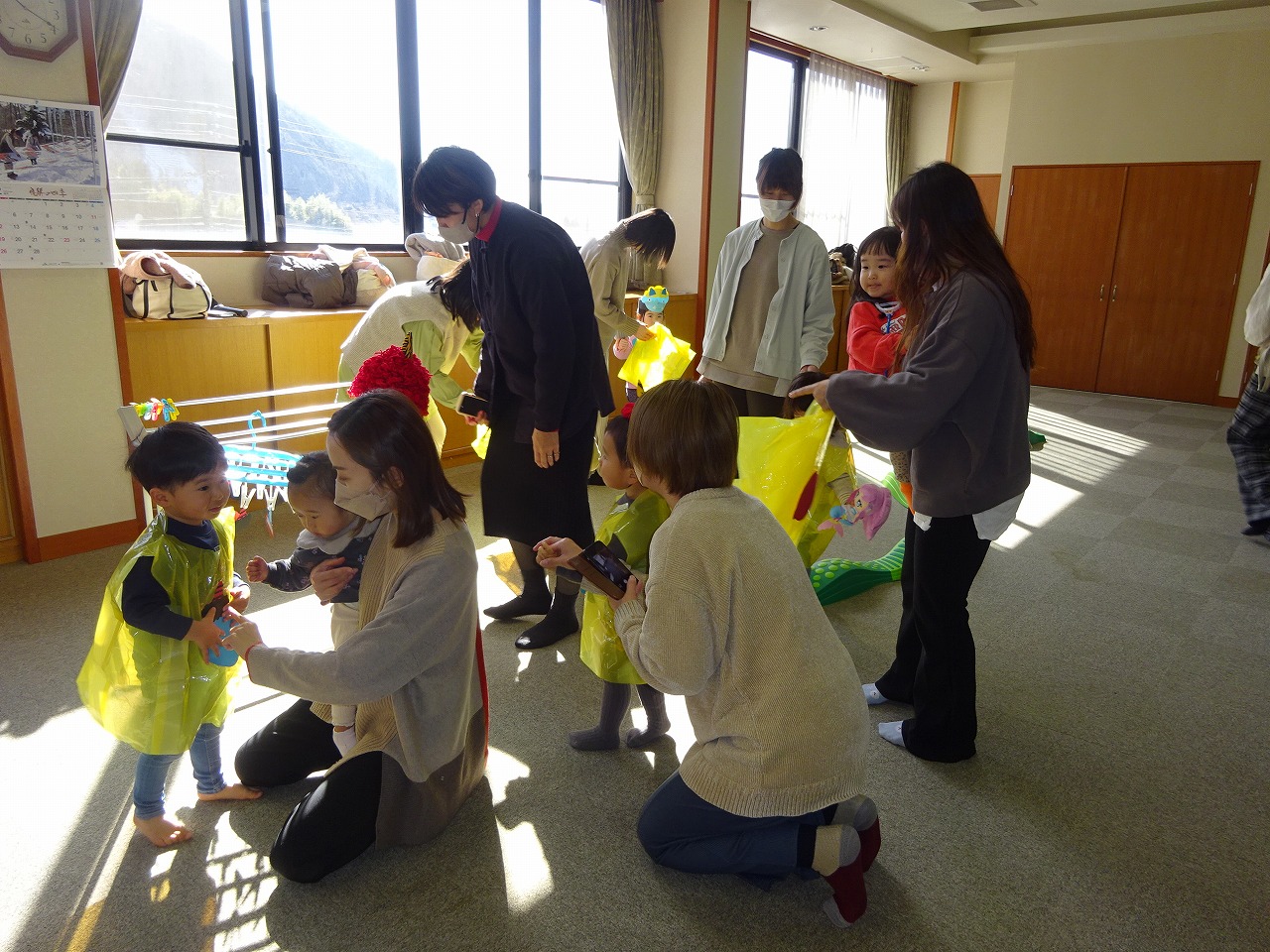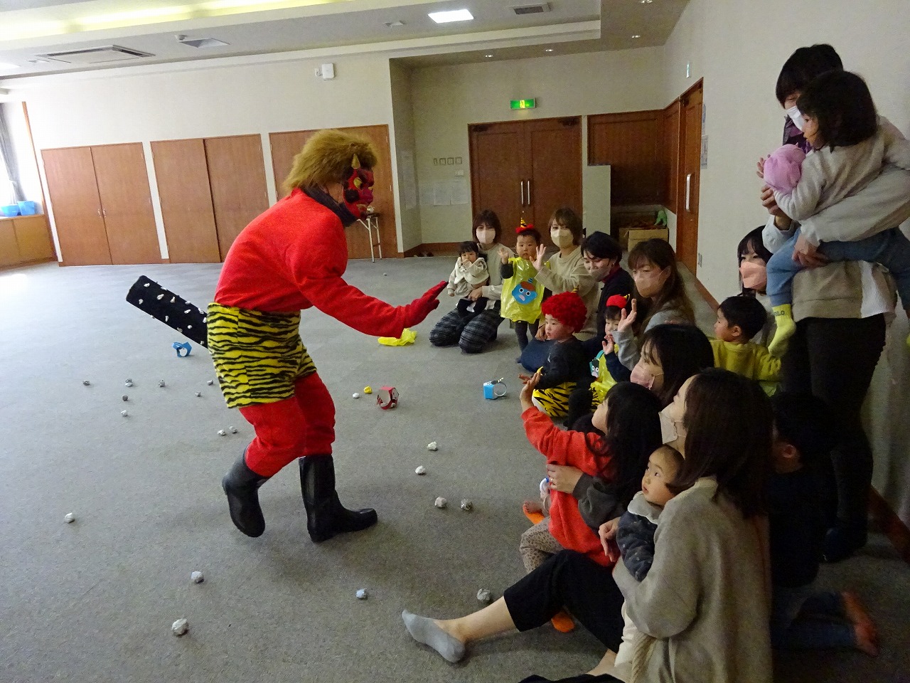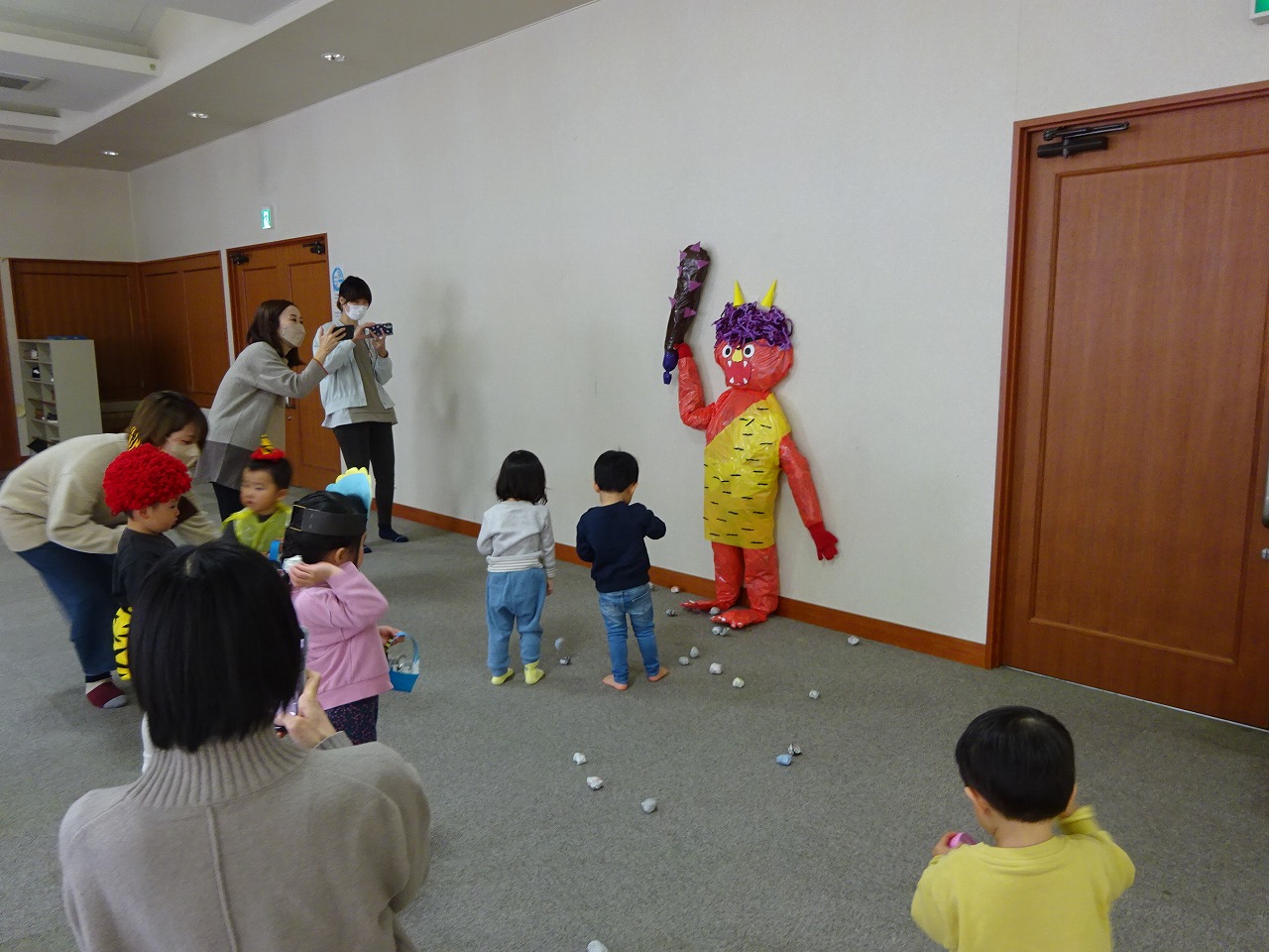 2月6日(月)ひよっこくらぶで節分の会を行いました。初めに役員さんが考えて下さった鬼のラリーを行い、サーキットを進んでいくと鬼の顔が完成しました。その後、お母さんたちが輪になりお子さんの心の中の鬼を発表し壁の鬼に向かって「おにはーそと!」とみんなで心の中の鬼を退治しました。これで安心と思っていたところに本物の鬼が登場!泣く子、お母さんにしがみついて離れない子いろいろでしたが、中には「おにはそと!」と頑張って豆まきする子もいました。最後は鬼とタッチ、写真撮影をして本当に鬼を追い払い安心した子ども達でした。この1年みんなが元気に過ごせますように。