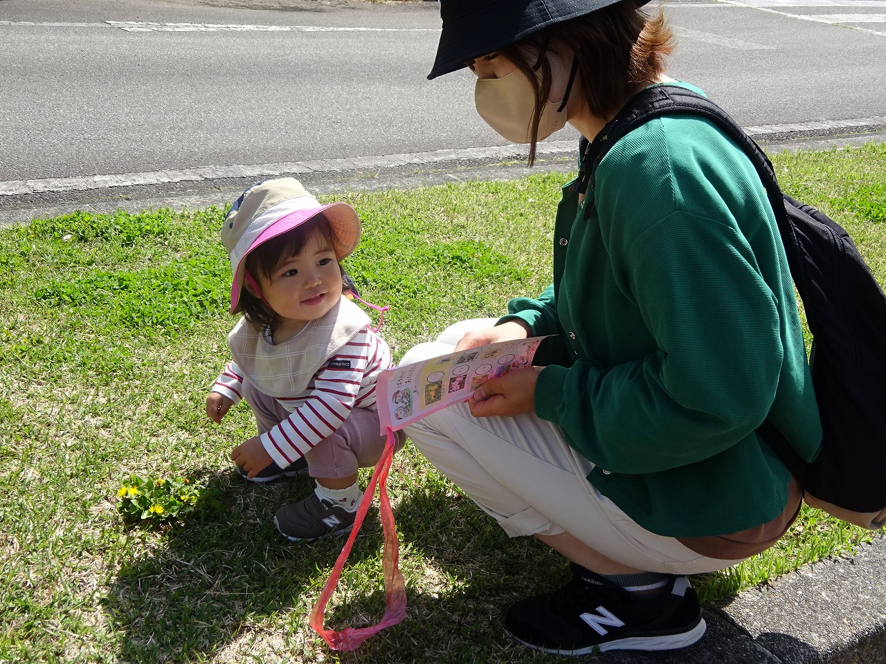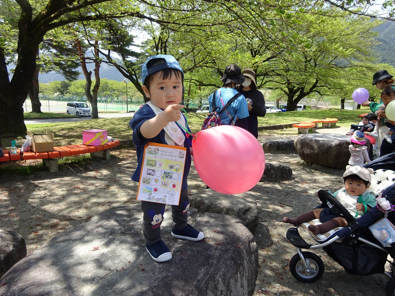 4月20日(木)馬瀬・萩原子育て支援センター・北児童館合同で『飛騨川公園春見つけ散歩』を行い、14組の親子が参加しました。 お母さんと手をつないで歩いたり、ベビーカーに揺られながら親子で春の草花などを見つけ、嬉しそうにカードにシールを貼っていました。 アンパンマンのメダルや風船のプレゼントもあり、暖かい陽気で春をたくさん感じながら楽しむことができました。