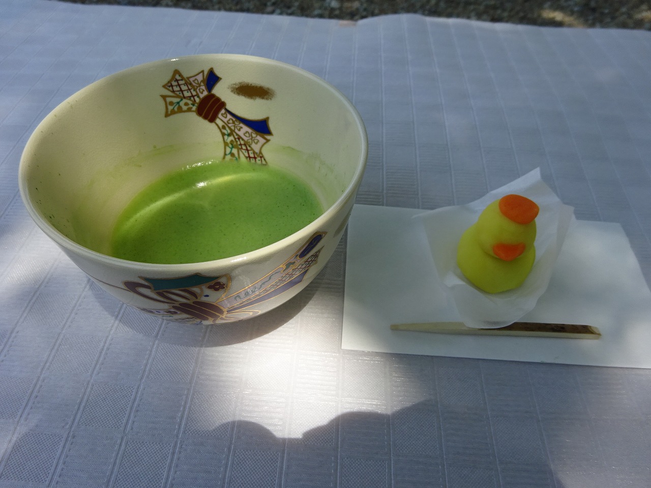 先生からお茶の頂き方などを聞き、いつもと違う雰囲気の中かわいいひよこのお菓子が配られると美味しそうに食べたり、先生に一人ひとり抹茶を立てていただき飲んだりしました。心地よい春風を感じながら先生の素敵な着物姿、非日常を過ごしている気分に。貴重な経験ができてお母さんたちも満足そうでした。