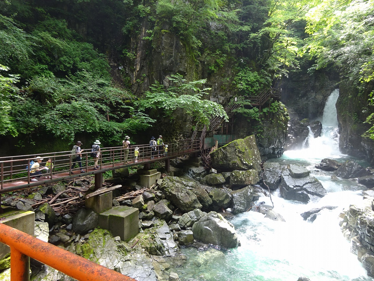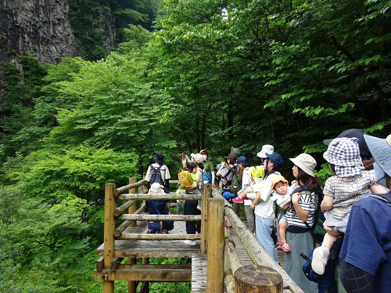 7月12日(水)、小坂子育て支援センターとコラボ企画で『小坂の滝めぐり』を行い、11組の親子の参加がありました。ガイドの皆越眞佐代さんにがんだてについての話、滝めぐりの案内、草花の話など色々なお話をしていただき、お子さんやお母さんも聞き入っていました。滝には抱っこで行く子、歩いて行く子と様々でしたが、マイナスイオンをたくさん浴び、自然の中で気持ちよく散策しながら楽しむことができ、皆さん癒されていました。