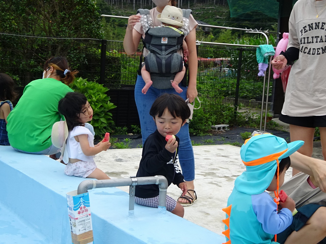 7月19日(水)馬瀬、萩原子育て支援センター、北児童館コラボ企画で『馬瀬のプールであそぼう』を行い、8組の親子が参加されました。 絵本を見て真似をして体操をしてからプールへ。金魚すくい等おもちゃで遊んだり、大きい方のプールでわにさん泳ぎに挑戦したりとみんな思い思いに楽しんでいました。途中みなみこども園のおひさま農園で採れたスイカも食べ、満足そうでした。