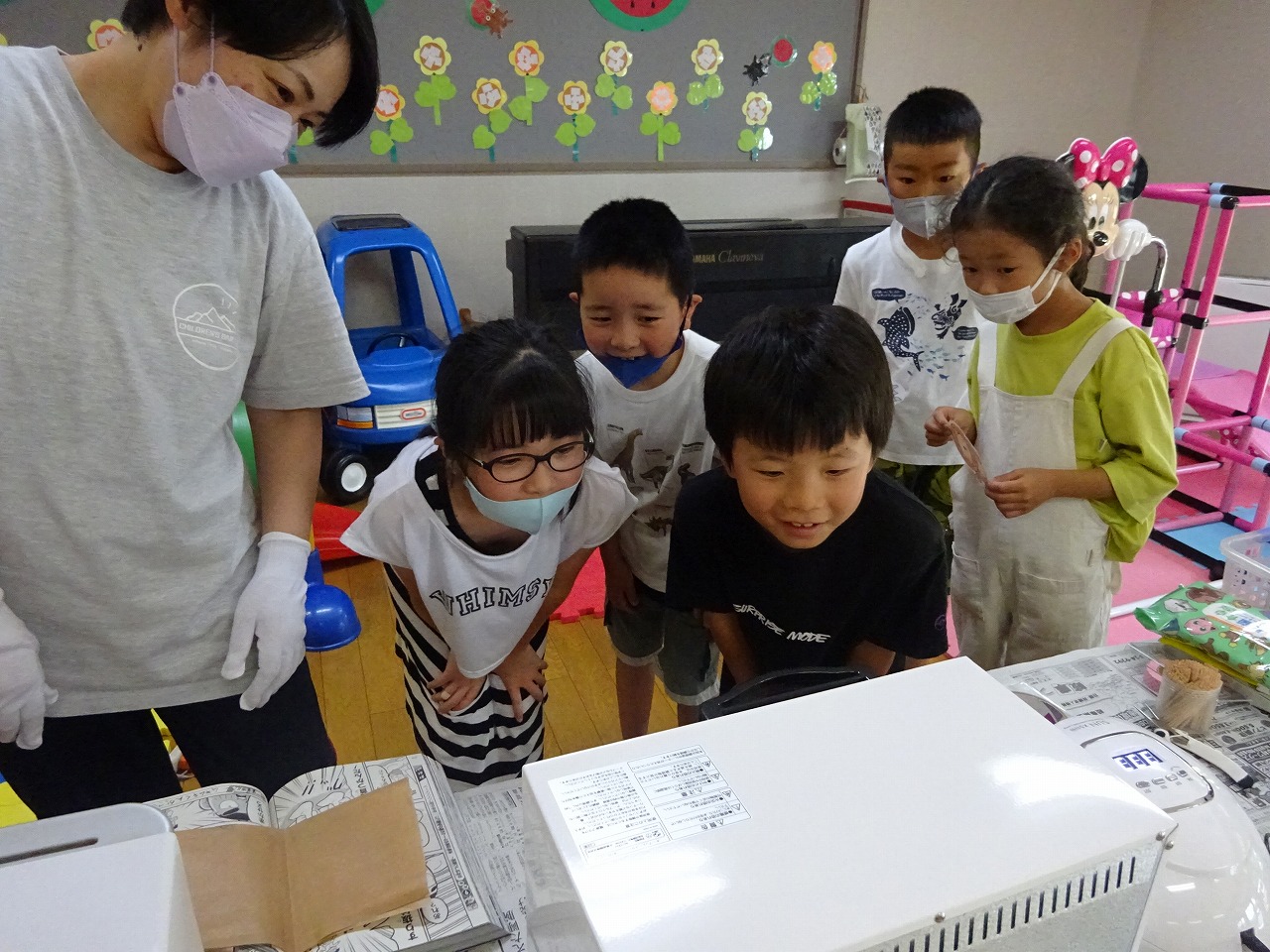 7月31日(月)夏休み小学生企画『プラ板キーホルダー作り』を行い、小学生13人を含む23人の参加がありました。 シートにお気に入りの絵の輪郭をマジックで描いたり写したりして、裏側から色ペンや色鉛筆等を使って色を塗っていきました。トースターに入れると小さくなっていくのをワクワクしながら見て、レジン液でコーティングをしながら飾りをつけ、LEDライトで固めて完成させました。出来上がるとどの子も嬉しそうに見せてくれ、楽しんで作っていました。