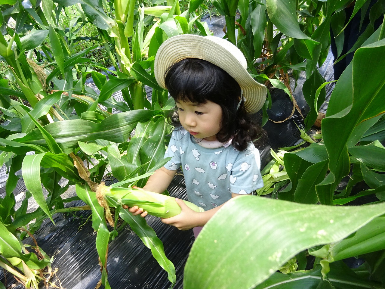 8月1日(火)おひさま農園day『とうもろこしの収穫』を行い、8組の親子が参加してくれました。 「たくさん立派なとうもろこしができてる」「とうもろこし好きでよく食べます」と皆さんみずみずしいとうもろこしをボキッと折って収穫していました。カメムシなど虫にびっくりする子、皮をむくのが楽しい子と色々な姿が見られ、大きなとうもろこしを喜んで収穫できました。甘いかな?味はどうだったかまた聞いてみたいと思います。