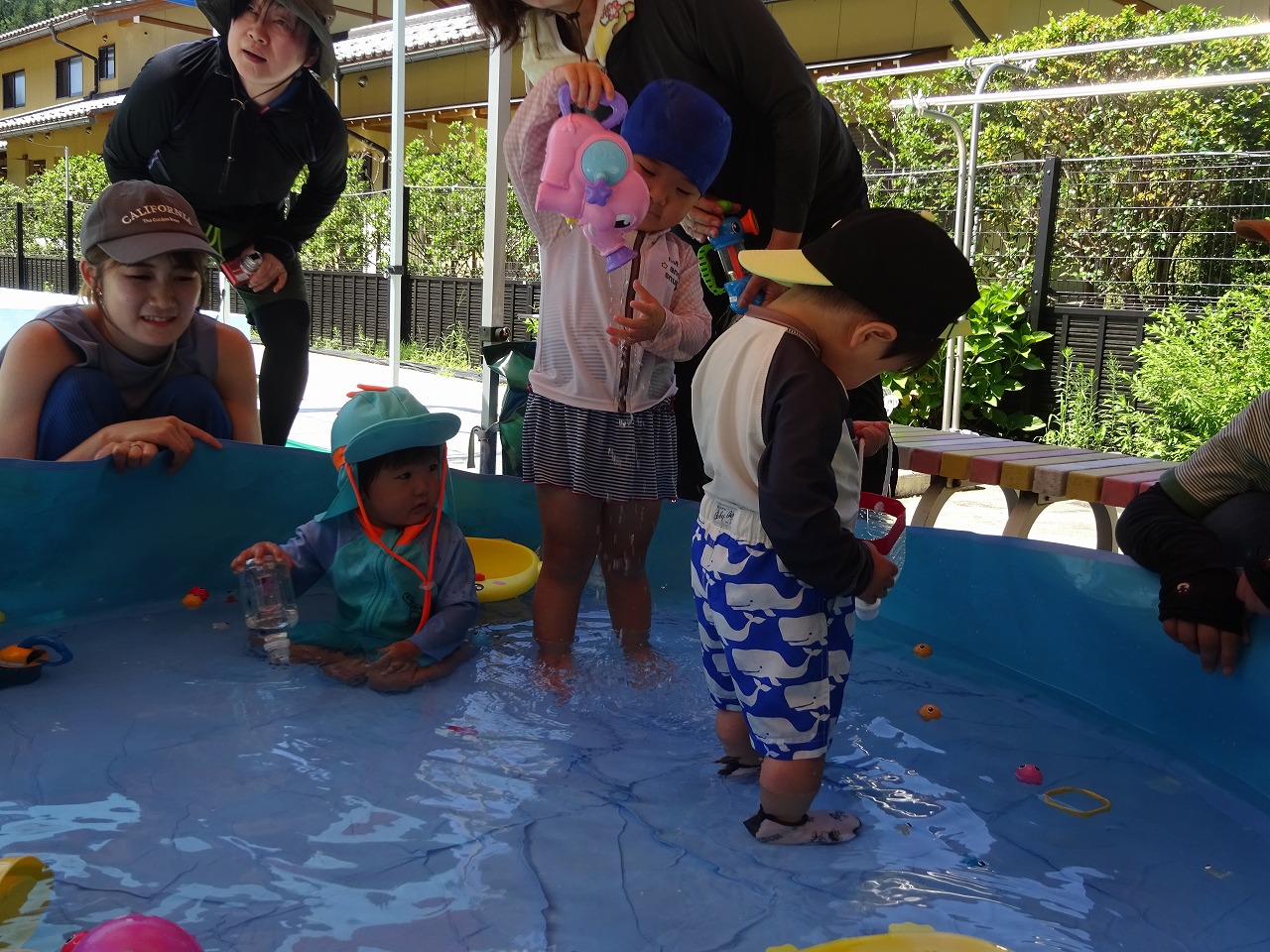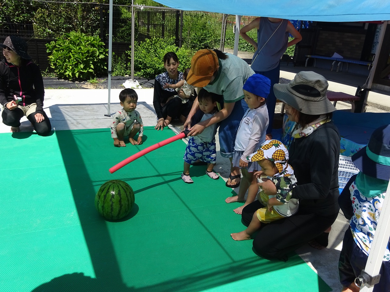 8月10日(木)『馬瀬のプールであそぼう』を行い、8組の親子が参加されました。とても暑い日で気持ちよく水遊びができ、大きなプールに喜んで入る子どもたち。 今回はスイカ割り!一生懸命割ろうと盛り上がりました。7.2キロのスイカはとても甘くておかわりもたくさんして食べました。ヨーヨー遊びもしてどの子も楽しく過ごせました。