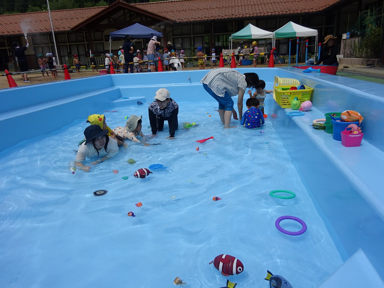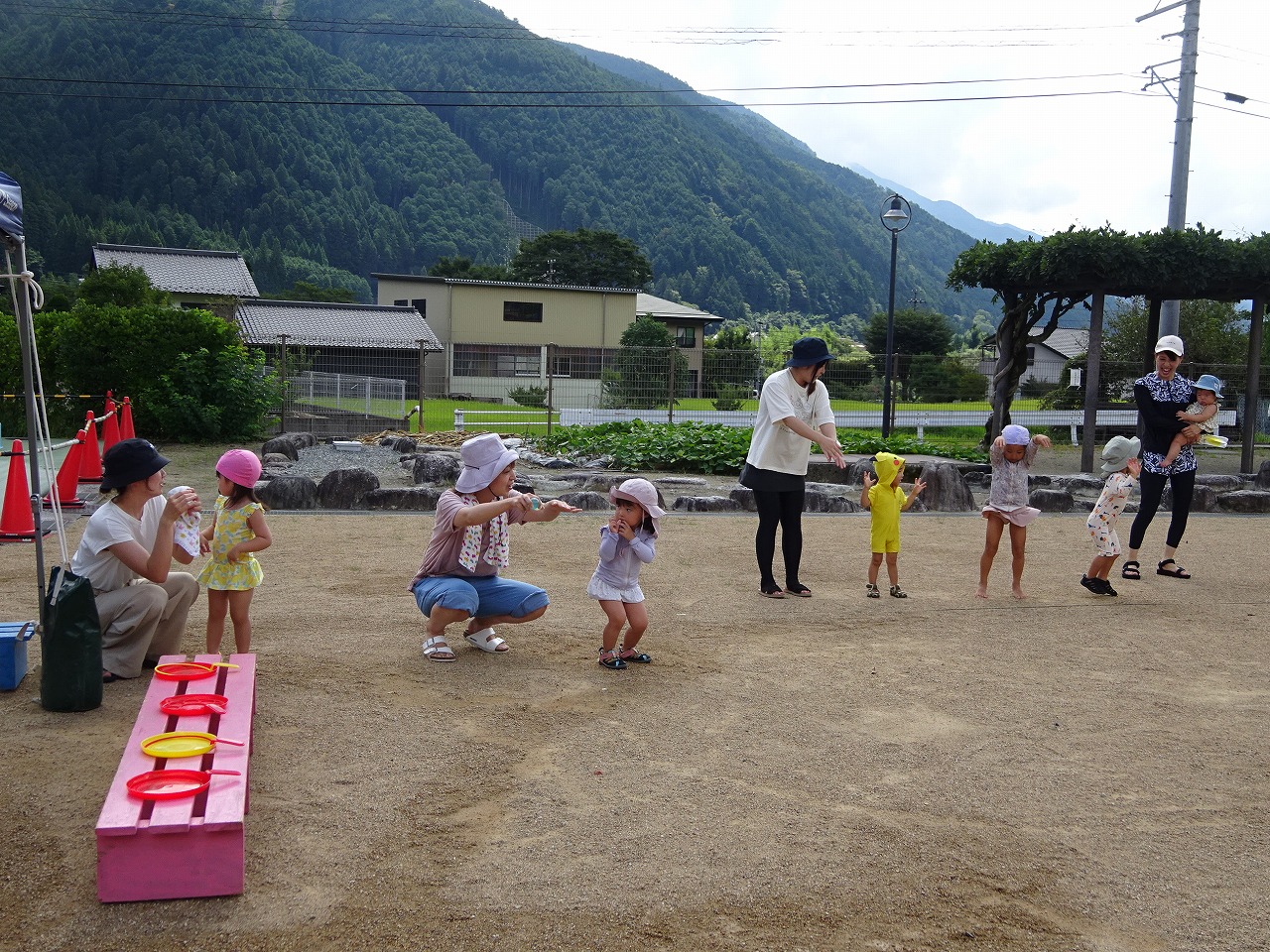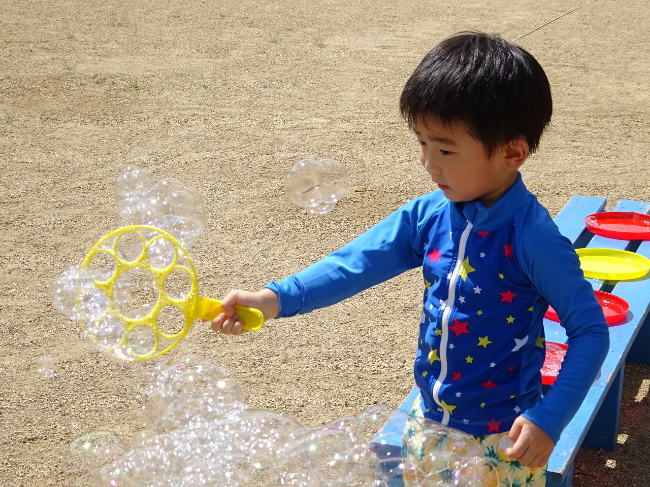 8月23日(水)今年度初めて園庭開放を行い、7組の親子が参加しました。 着替えたら園庭に出て、こども園のお兄さんお姉さんと一緒に体操をしてからプール、しゃぼん玉遊びをしました。しゃぼん玉が綺麗に風に吹かれて喜んだり、大きなプールでのびのびと遊べて楽しそうでした。園児とも触れ合えてよかったです。