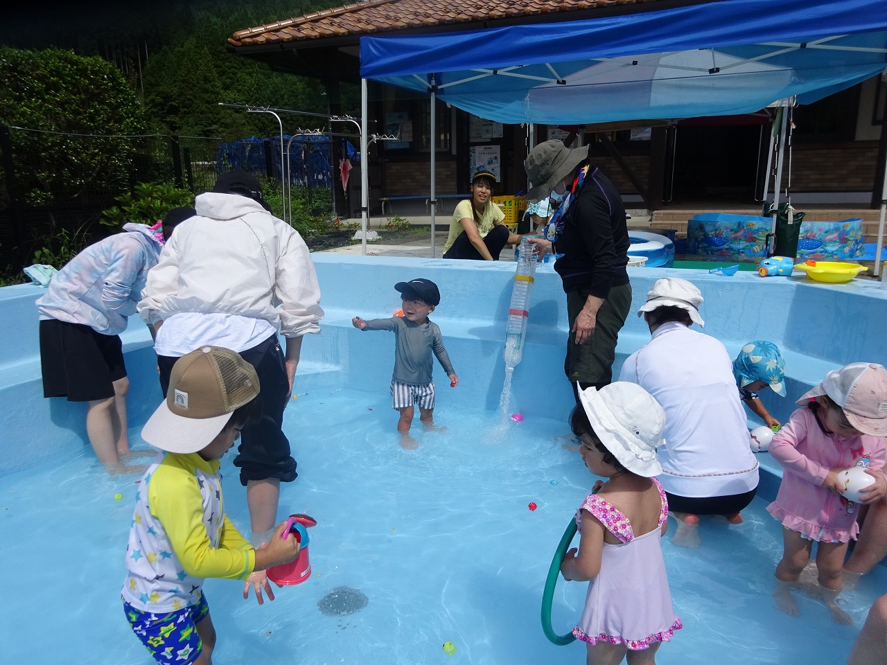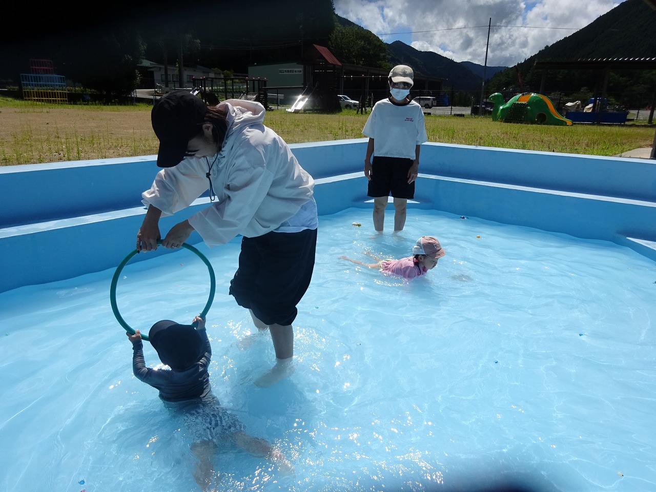 8月25日(金)馬瀬・萩原・北児童館コラボ企画で『馬瀬のプールであそぼう』を行い、6組の親子が参加してくれました。 今季3回目でどの子も水に慣れ、プールの中でわにさん泳ぎをしたり、フープにつかまって引っ張ってもらって泳いだりとのびのびと遊ぶ姿がみられました。また、金魚のおもちゃを水流にのせて泳がせたりして楽しんでいました。今年もたくさんプール遊びができてよかったです。
