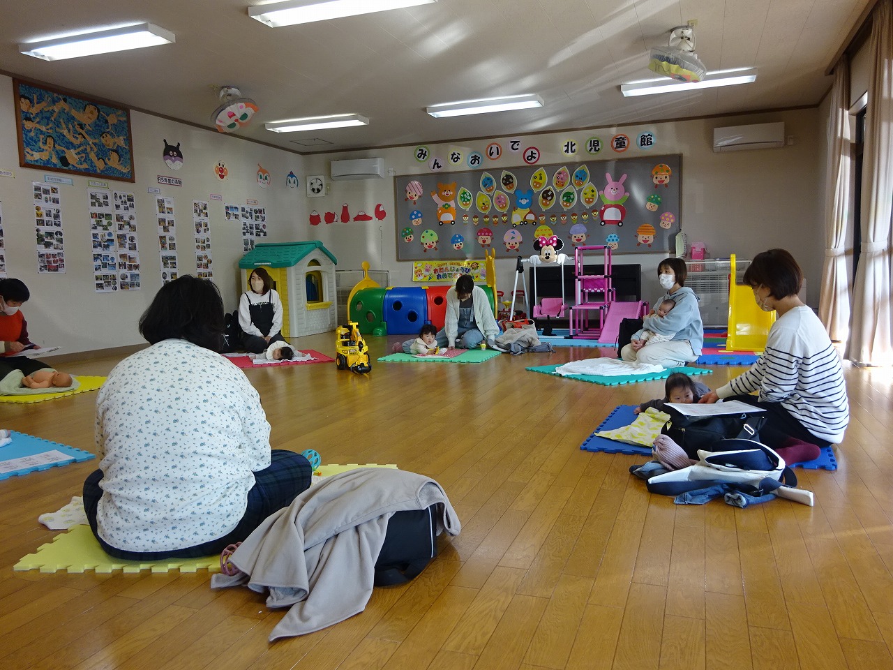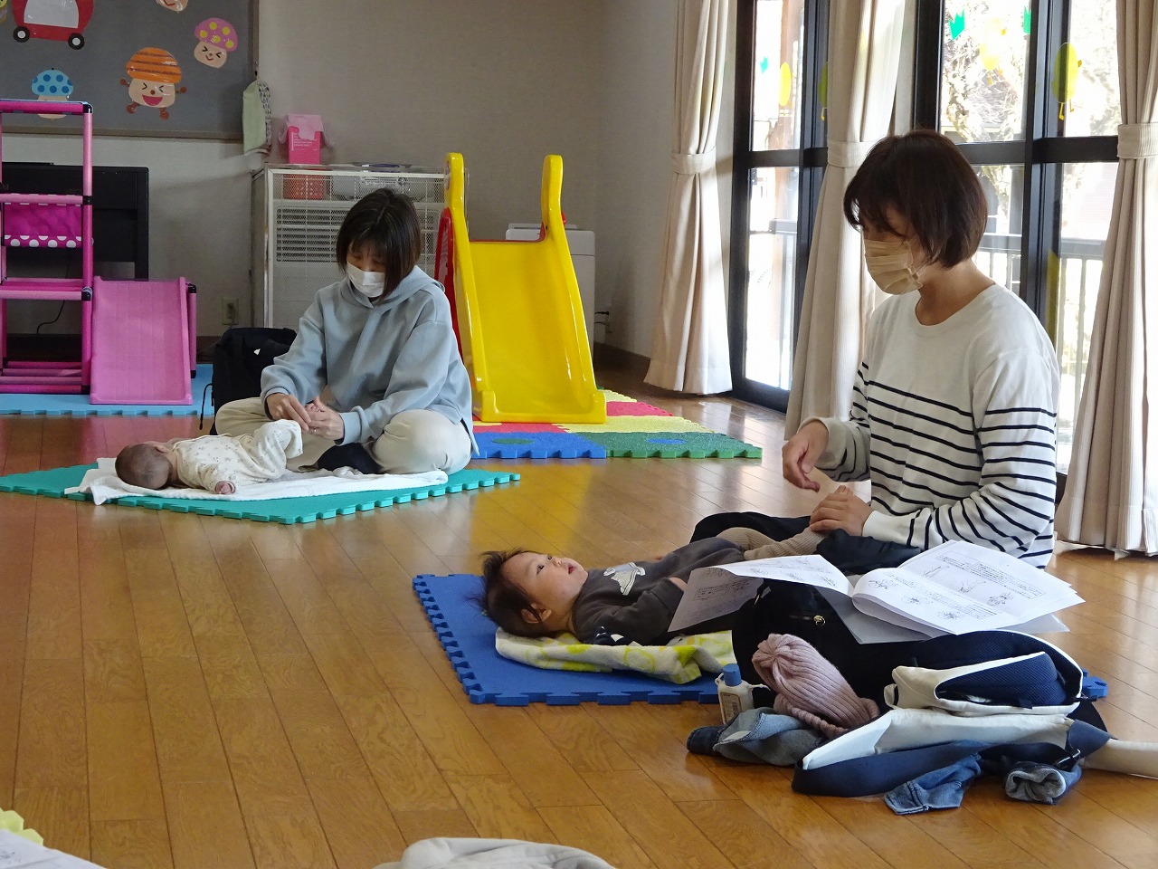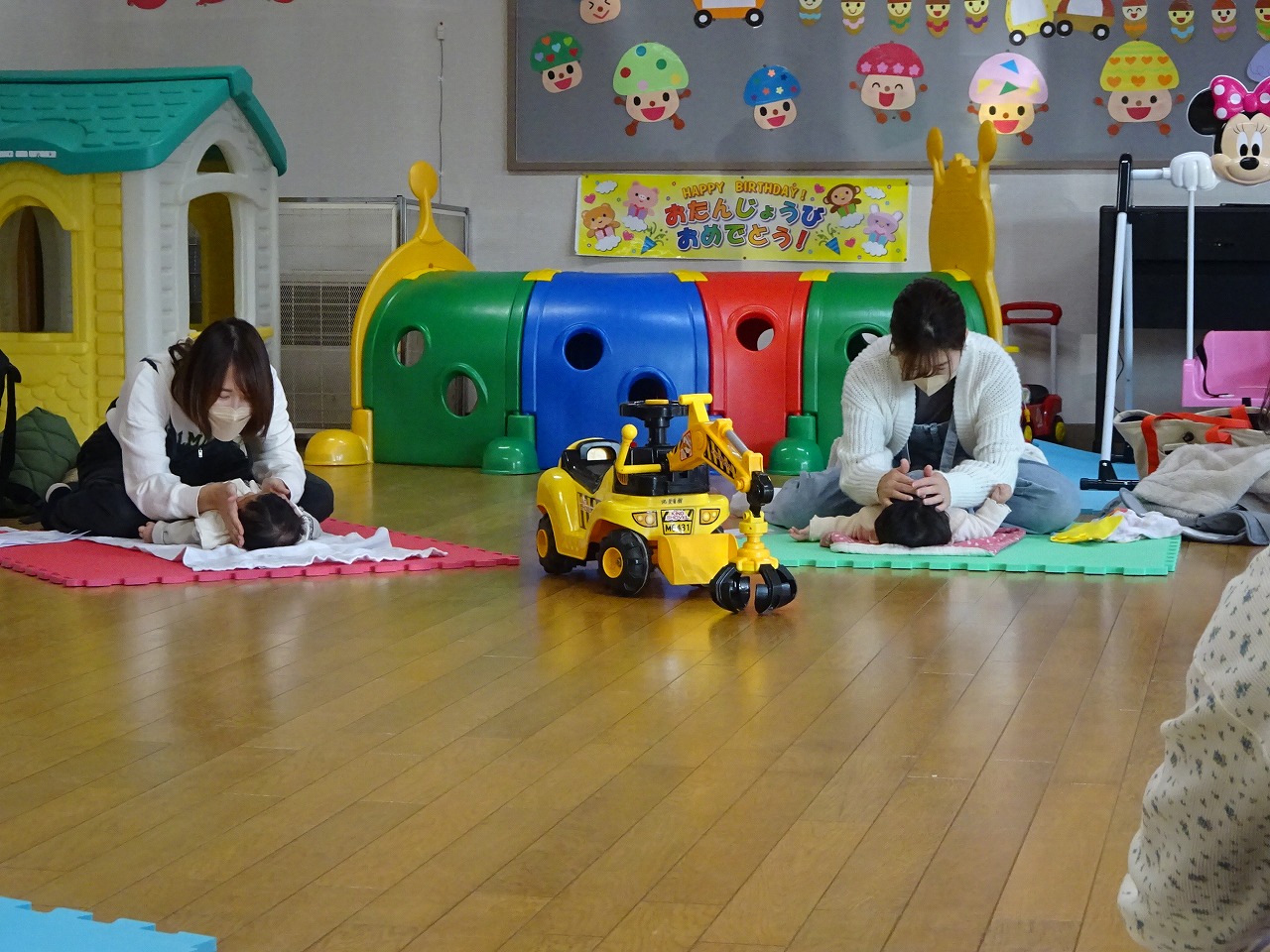 11月27日(月)ベビーマッサージを行い、6組の親子が参加してくれました。 気持ちがいいのかみんな落ち着いていて、とても笑顔でマッサージをお母さんにしてもらっていました。睡眠時間や、寒くなってきたので夜の暖房事情等悩んでいることを、先生やお母さんたちに話を聞くことができて気持ちが軽くなったようです。気軽に交流ができる場となり、楽しく子育てができればいいなと思います。 次回の『ベビーマッサージ』は12月25日(月)10時から行います。お気軽にお申し込みください。