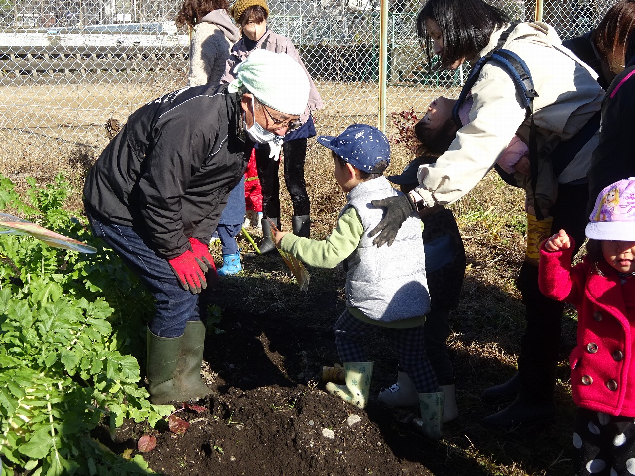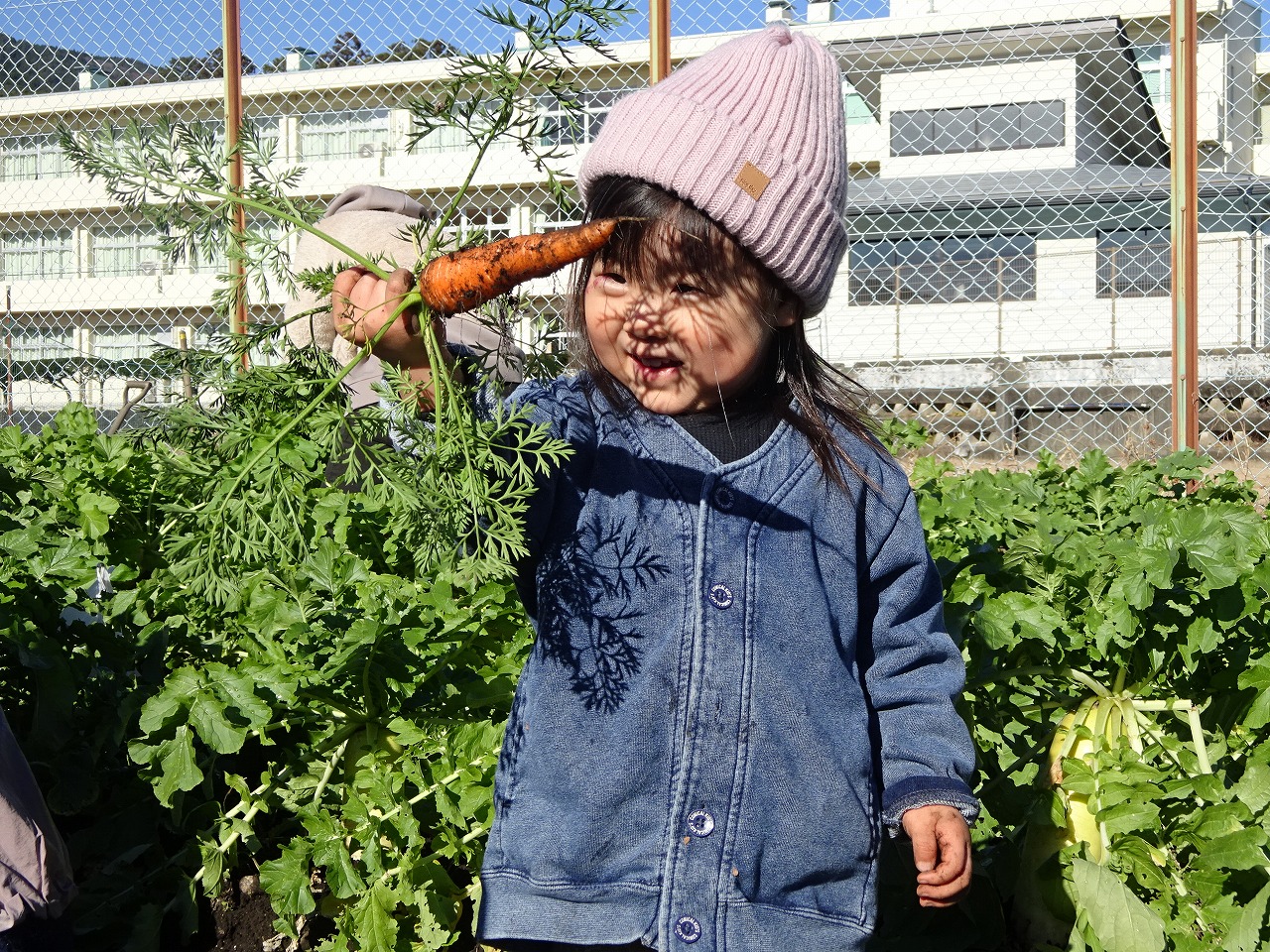 12月4日(月)最後のおひさま農園dayを行い、10組の親子が参加してくれました。1年間お世話なった畑の先生にお礼を伝え、カードをプレゼントしました。その後ヤーコン、大根、人参を抱えきれない程収穫し、子ども達もお家の方も笑顔があふれていました。 来年度もまたたくさんの方と農園活動を楽しめたらいいなと思います。1年間ありがとうございました。