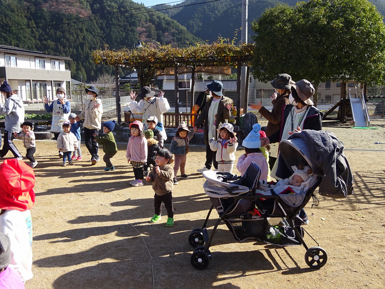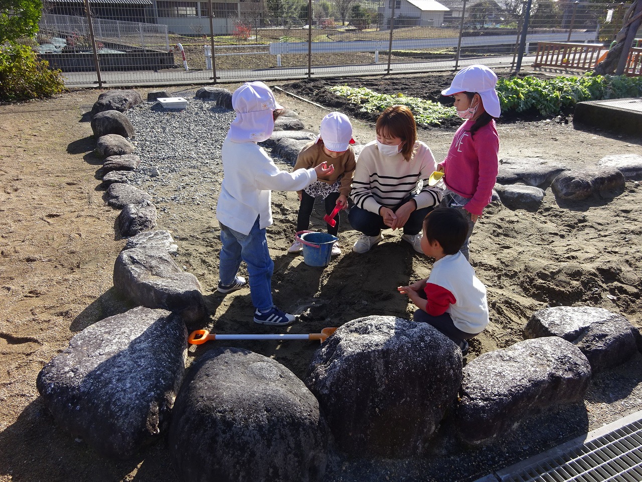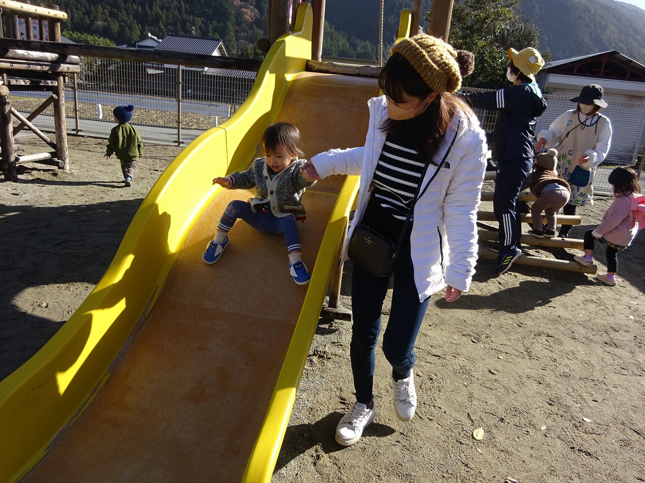 12月8日(金)園庭開放を行い、2組の親子と13人のくろすけのお友だちが遊びに来てくれました。 暖かい日で、砂場遊びやブランコ、ジャングルジム等大型遊具で体を動かして遊ぶ姿がみられました。遊びの最中に地震の避難訓練を園児と一緒に行いましたが、先生の指示に従って園庭の真ん中に集まり、身を守ることができました。最後は大好きなアンパンマン体操をみんなで踊り楽しみました。