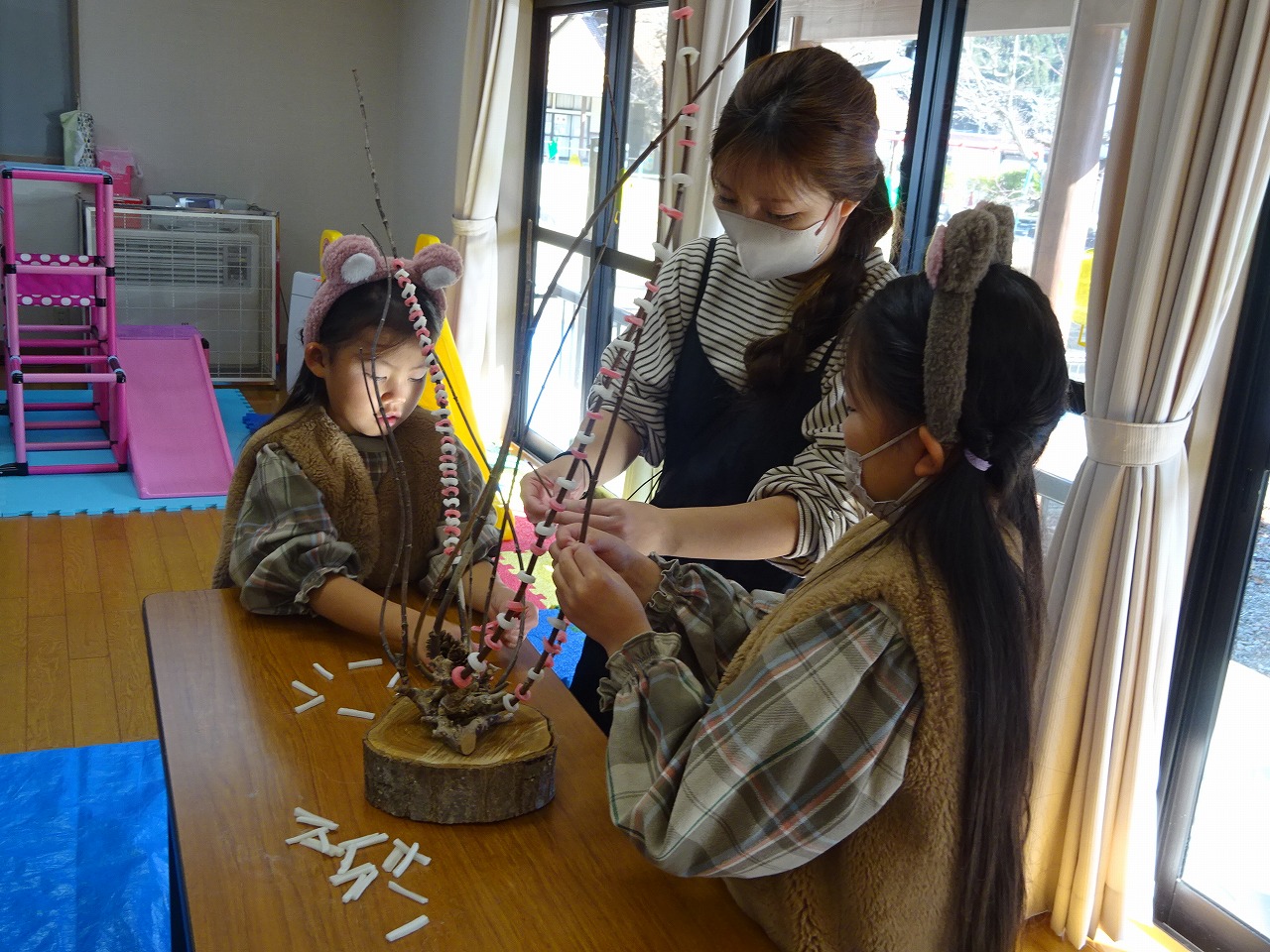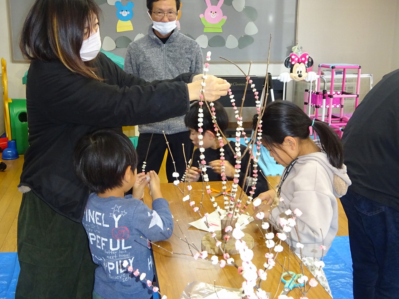 12月9日(土)小学生企画『花もち飾り』を行いました。 講師の清水さん、今井さんに丁寧に教えていただきながら、細かく切った紅白のおもちを巻いていきました。最初は集中してやっていても途中で飽きてきてしまう子もいましたが、親子で協力して作りました。最後は自然物やおもちでハートや来年の干支、辰を作って飾り素敵な花もち飾りが完成しました。
