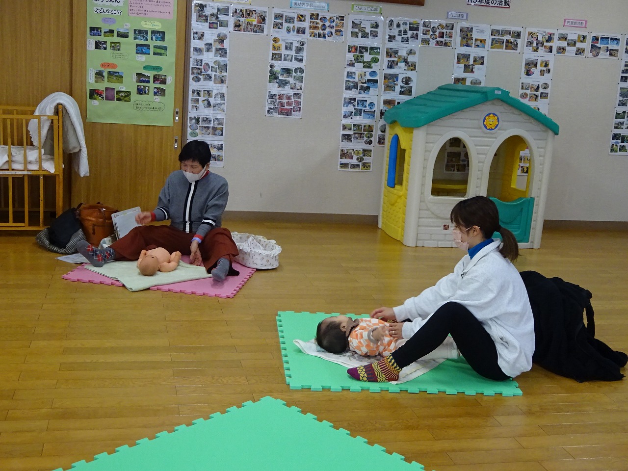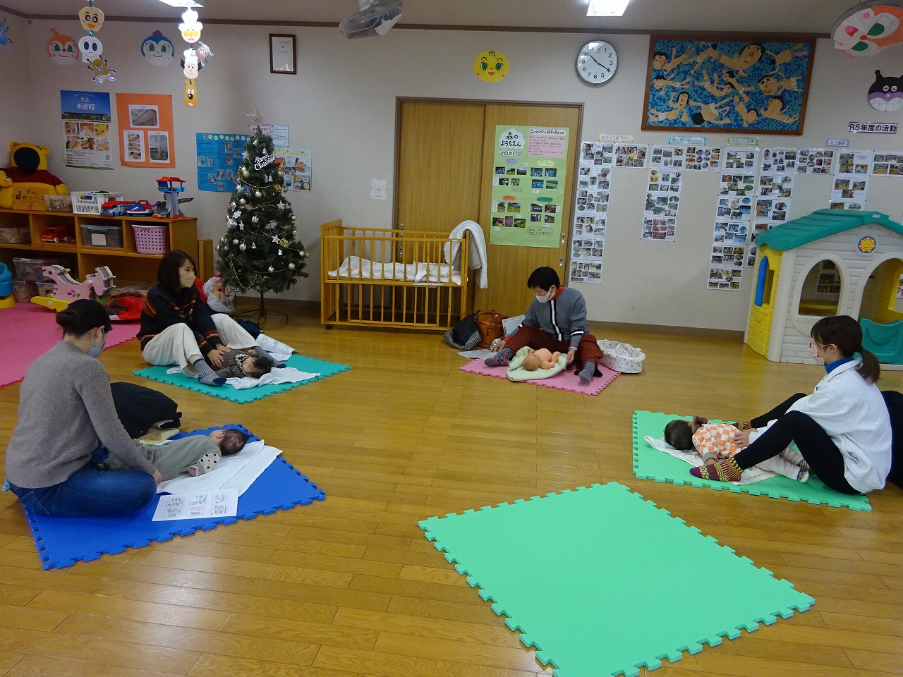 12月25日(月)ベビーマッサージを行い、3組の親子が参加しました。 赤ちゃんたちはお母さんと目を合わせ、笑顔で「あーあー」とおしゃべりしながら安心してマッサージをしてもらっていました。みなさん2人目の方ばかりでしたが、上の子の月齢や性別によっては悩みもさまざまでした。感染症対策や細かいおもちゃの危険について、先生やお母さんたちと交流ができました。 次回の『ベビーマッサージ』は1月22日(月)です。お気軽にお越しくださいね。