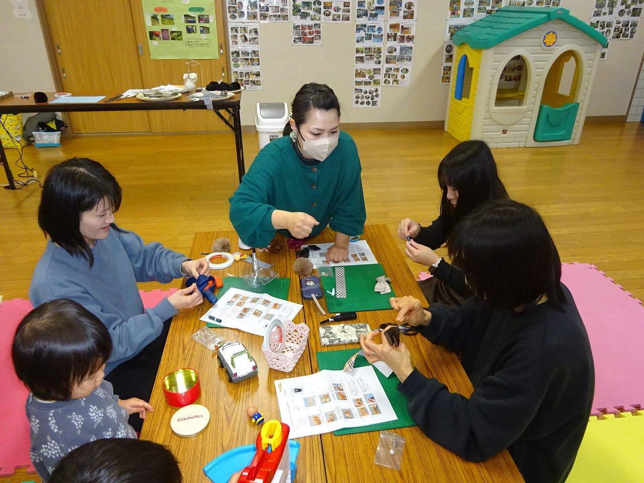 2月21日(水)小田千絵さんによる、ミニ講座『リボンのバックチャーム作り』を行いました。お母さん同士おしゃべりしながらゆったりとした雰囲気の中で作りました。柄や色の組み合わせを考えるのもわくわくしながら皆さん真剣に考えて作っていました。オリジナルのバックチャームができてお母さんたちは自分のカバンに付けたり、お子さんにプレゼントすると喜んでみえました。