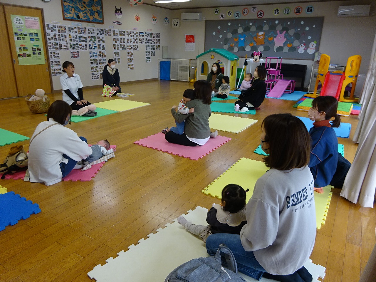 今月は股関節をやわらかくするふれあい遊びを教えてもらい、親子でたくさん触れ合うことができました。助産師のテーマは「いいタッチと悪いタッチの話」でした。お母さんたちは興味深く聞きいってみえました。