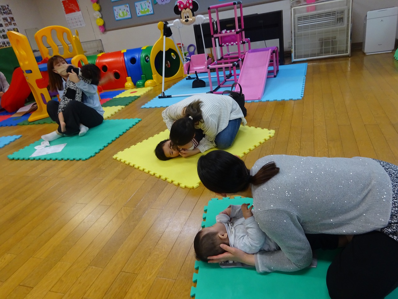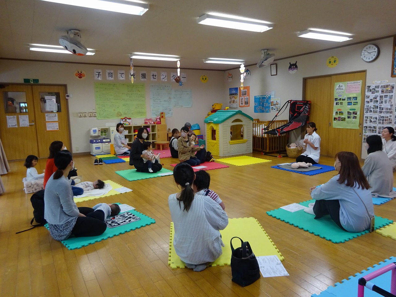 またベビーマッサージ講師の河村さんからは、「ふれあいは親子のお守り」というお話があり、赤ちゃんの成長には大好きなお母さんとのふれあいあそびが、心にもからだにも良い影響を与えていることを意識しながら、歌に合わせて愛情たっぷりのふれあい遊びを楽しみました。お母さんの我が子を愛しそうに見つめる表情が印象的で、癒しの時間になりました。