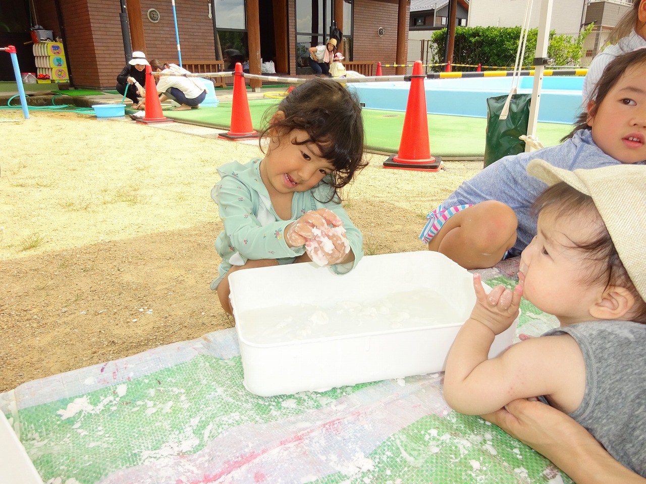 今月の園庭開放は、隣接するこども園の大きなプールを借りて水あそびを楽しみました。大きなプールでは、怖がることもなく、お母さんと一緒に水の感触を味わい、心地よさを感じることができました。またこども園のお兄さんやお姉さんと一緒に、シャボン玉やかたくり粉粘土あそびをして、初めての「トロトロ」「ツルツル」といったかたくり粉の感触あそびを経験し楽しみました。