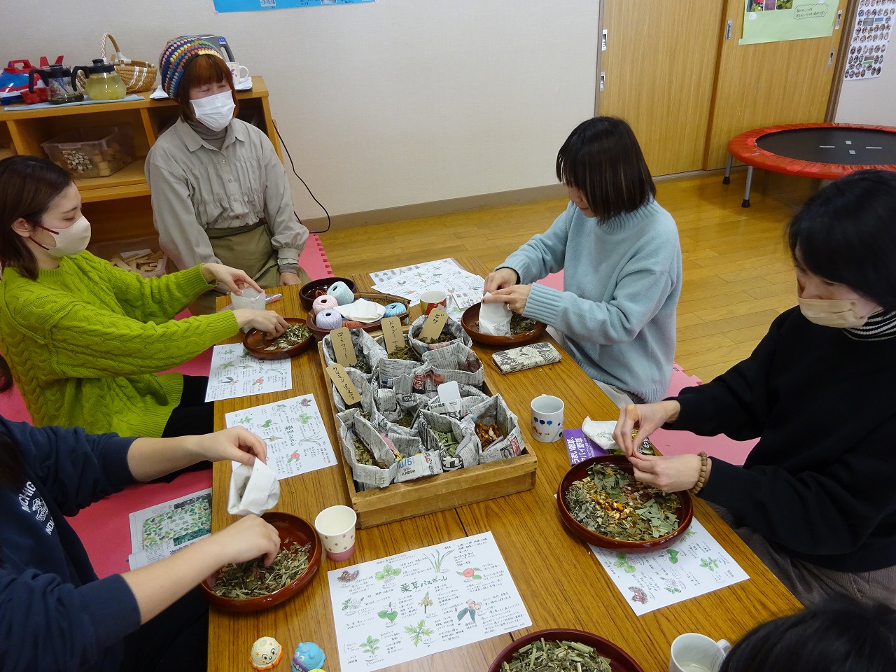 2月12日 講師に皆越さんをお招きして薬草バスボールを作りました。飛騨地方にある10種類の薬草を準備して下さった皆越さんに教えて頂きながら、自分の身体の状態に合わせた薬草を選び、布巾着に詰めていきました。お子さんと薬草の香りを楽しみ、ヒーリング効果抜群でした。自宅に帰ってからは完成したバスボールでゆっくりお風呂時間を楽しめるといいですね♪