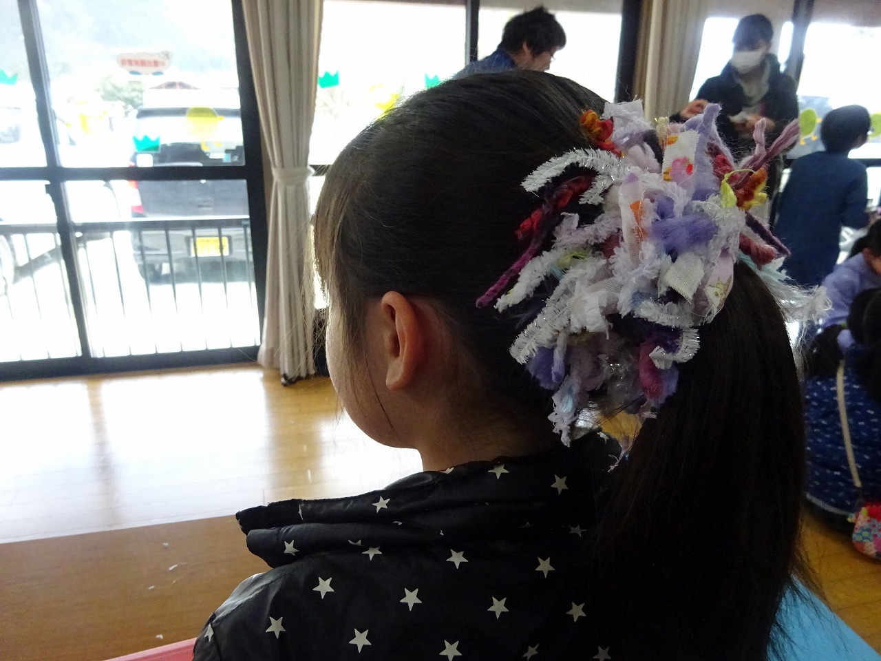 ヘアゴムにリボンや毛糸をひたすら結んで花束のようなシュシュを作りました。 |