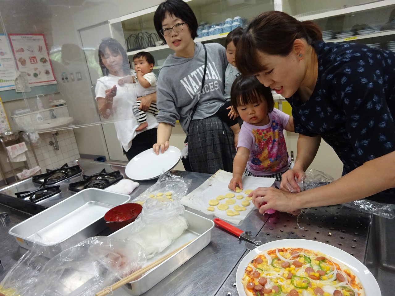 小坂健康ふれあいセンターにて、18組の親子が具だくさんの大きなピザとクッキー作りにチャレンジしました。 |