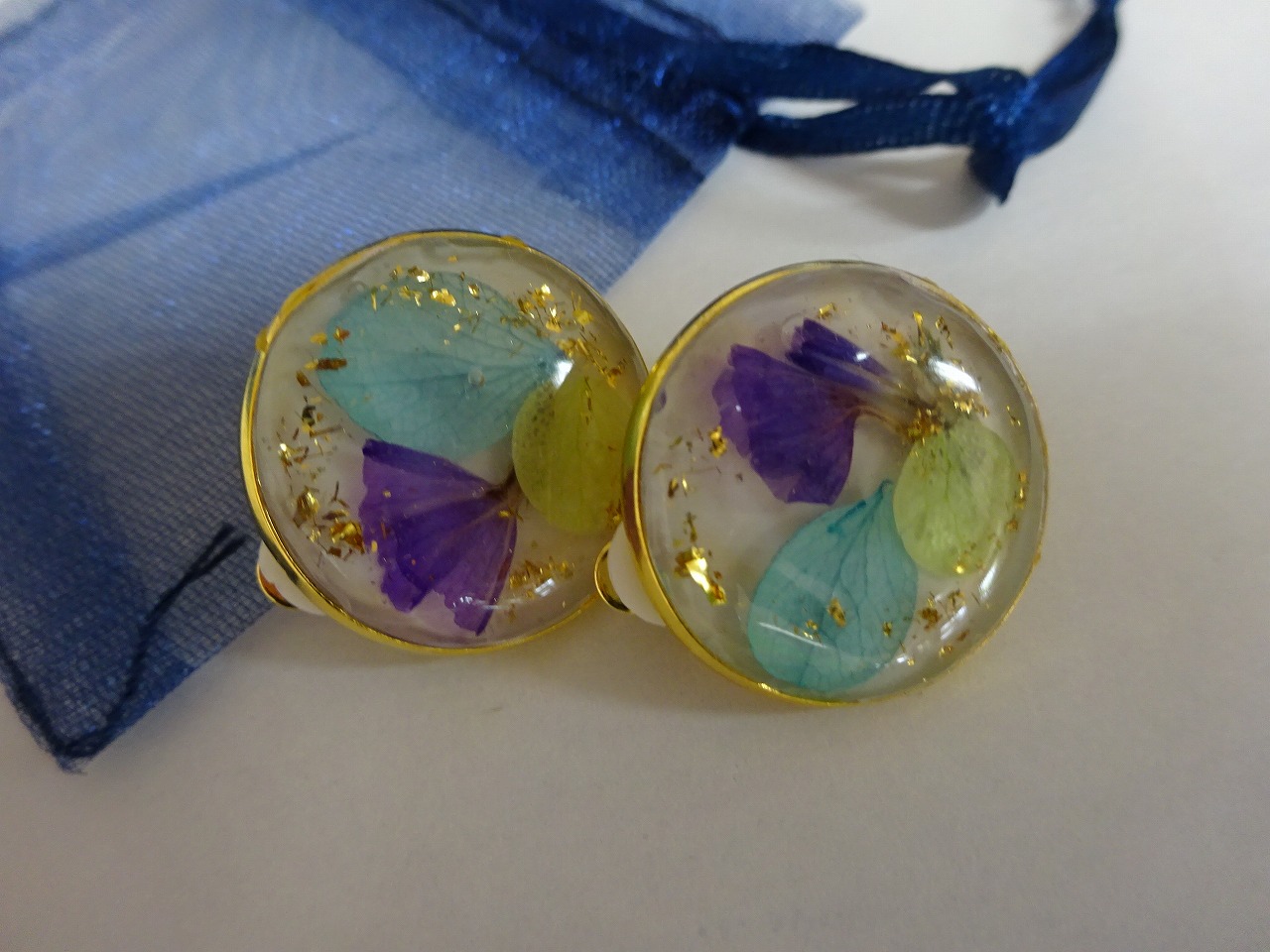LEDに反応し硬化するレジン液を使って、好きなドライフラワーとパーツを閉じ込めてオリジナルイアリングを作りました。 |