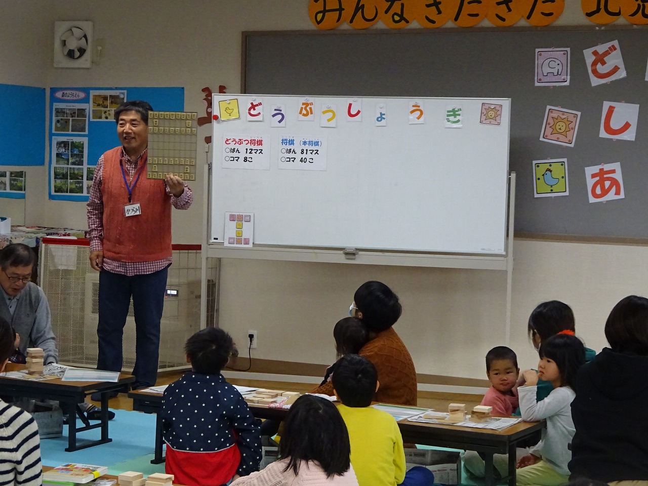 児童館の将棋教室でも活躍している桂川清先生から将棋のよさを教えていただいた後、親子でコミュニュケーションを取りながら、色塗りや土台となる木を紙ペーパーで削りました。 |