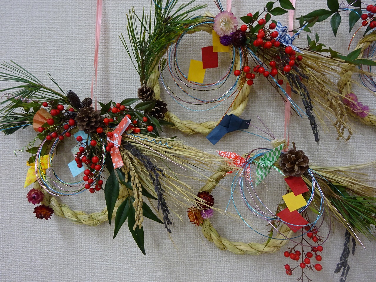 「五冠飾り」と言って縁起を担ぎ、南天・花・折り紙・松・水引の5点を使って「しめ飾り」を作って正月を迎える準備しました。 |
