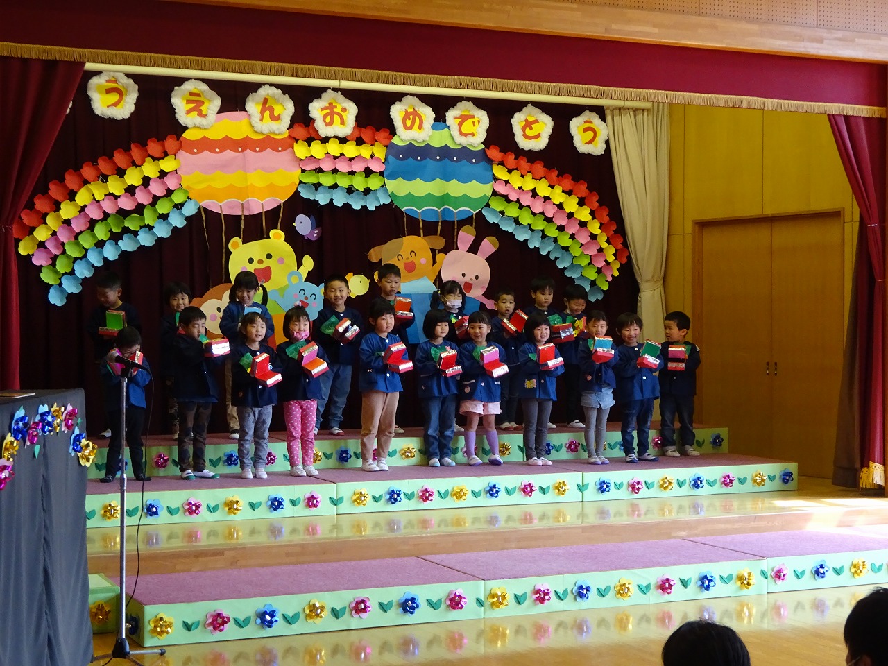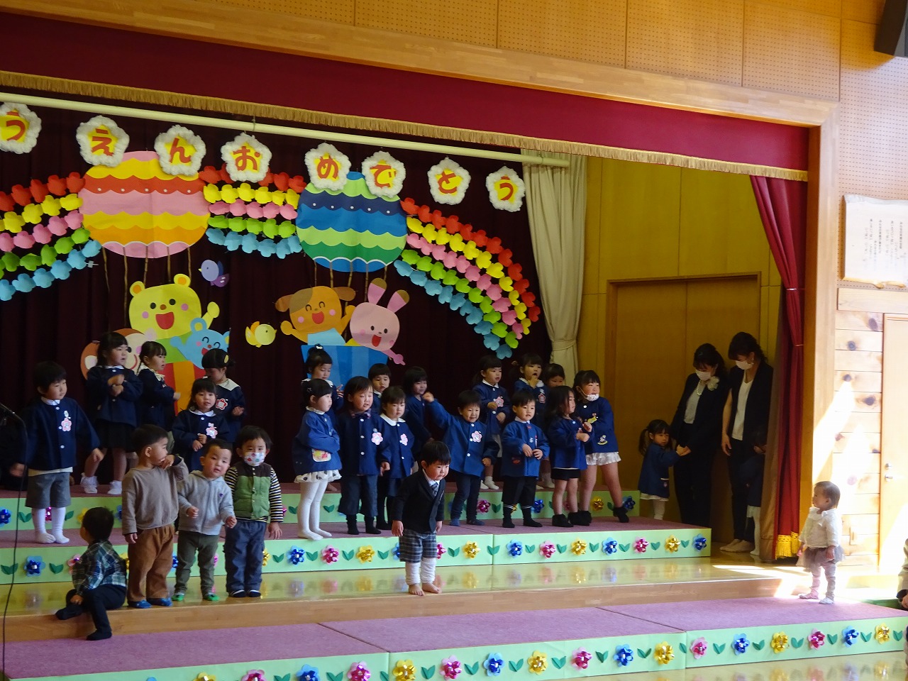 新入園児参加の入園式では、担任から名前を呼ばれ、大きな返事をしてステージに上がる子もいれば、恥ずかしくてお家の人と一緒に上がる子もいました。その後は得意のアンパンマン体操をみんなで踊りました。規模を縮小して行った入園式でしたが、皆さんのご協力のお陰で無事に終えることができました。いよいよ新しい1年が始まりました。きたっこパワーで、元気いっぱい楽しく過ごしましょう。
