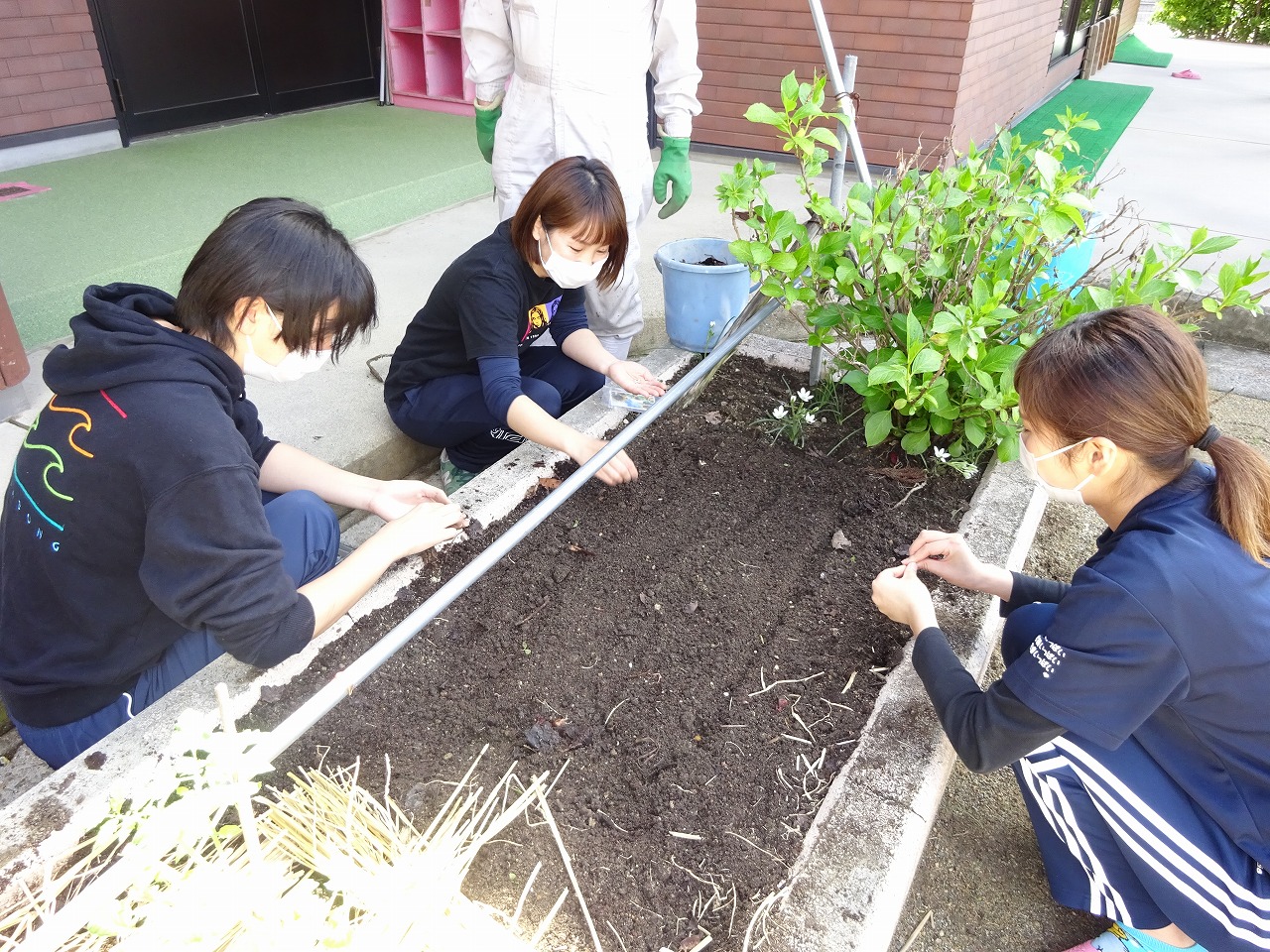 こども園がお休みの間に、未満児さんの先生たちでミニトマトの苗植えと、ひまわりの種植えをしました。