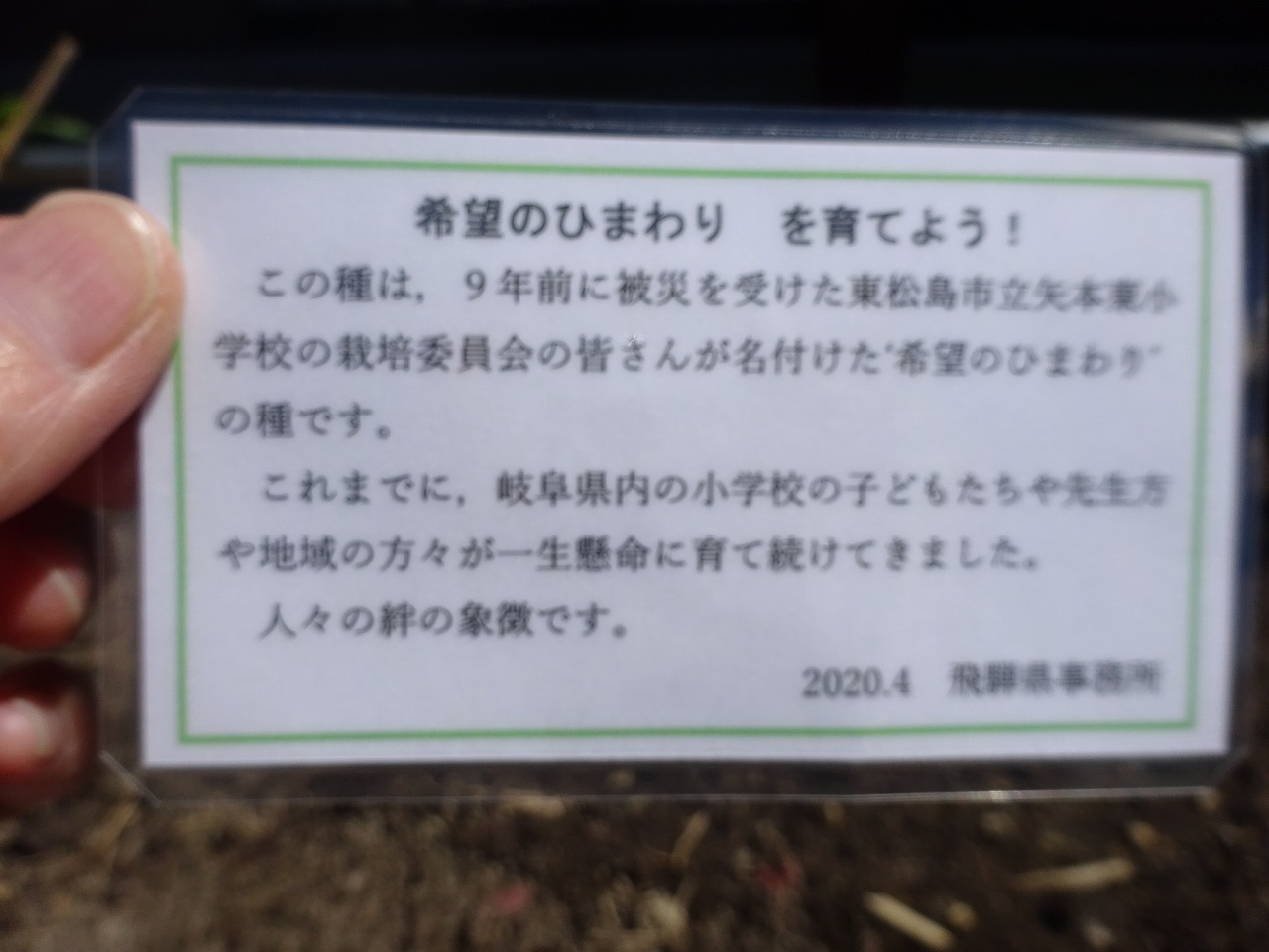 ひまわりの種は、東日本大震災の被災地の方々が育てた種をいただきました。未満児さんの花壇で大輪の花を咲かせてくれるとうれしいです。