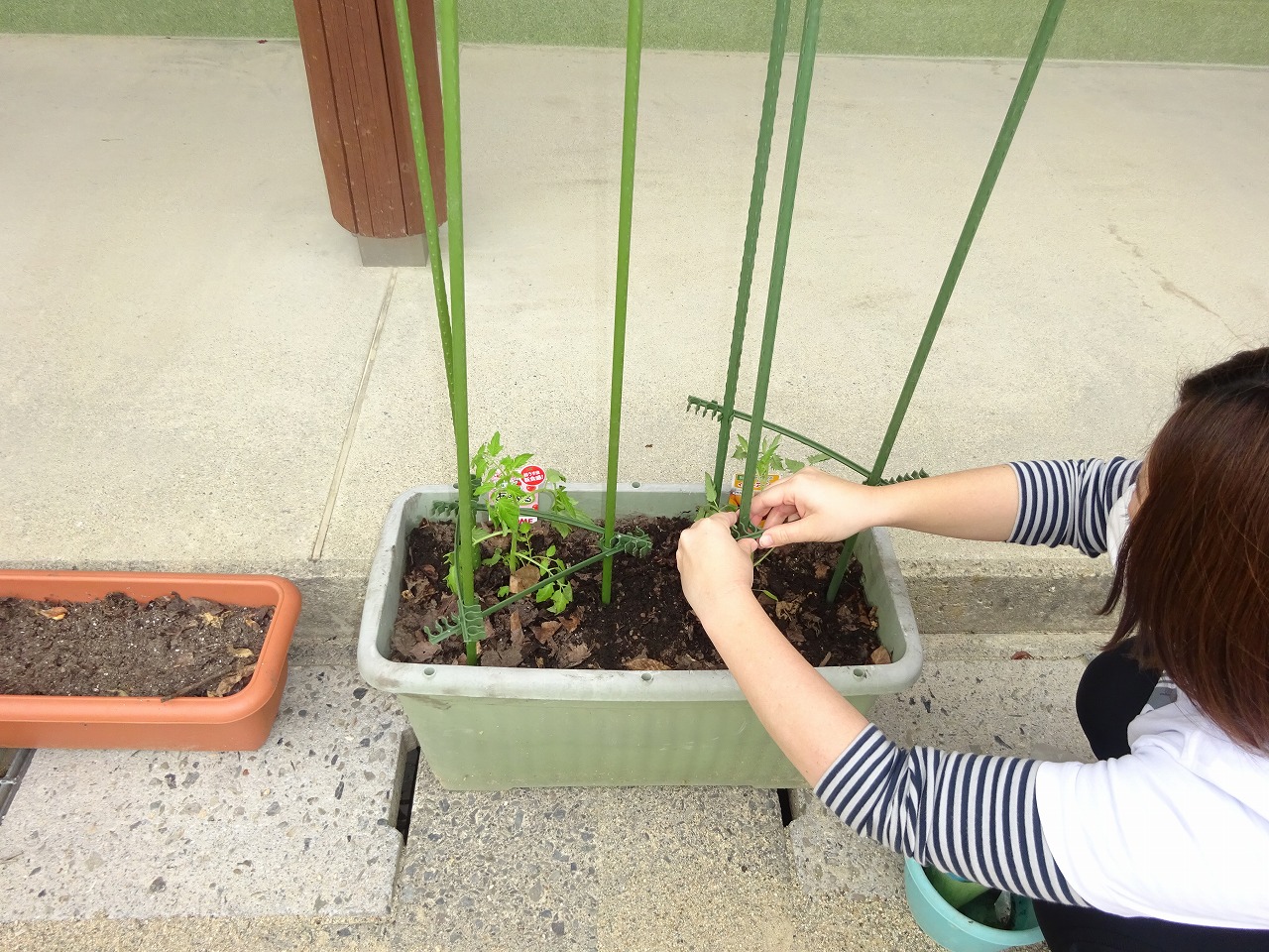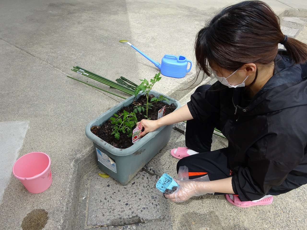 年少さんと年長さんの先生が、ミニトマトの苗植えをしました。本当はみんなと一緒にできると良かったのですが休園中ということで、先生たちが植えました。